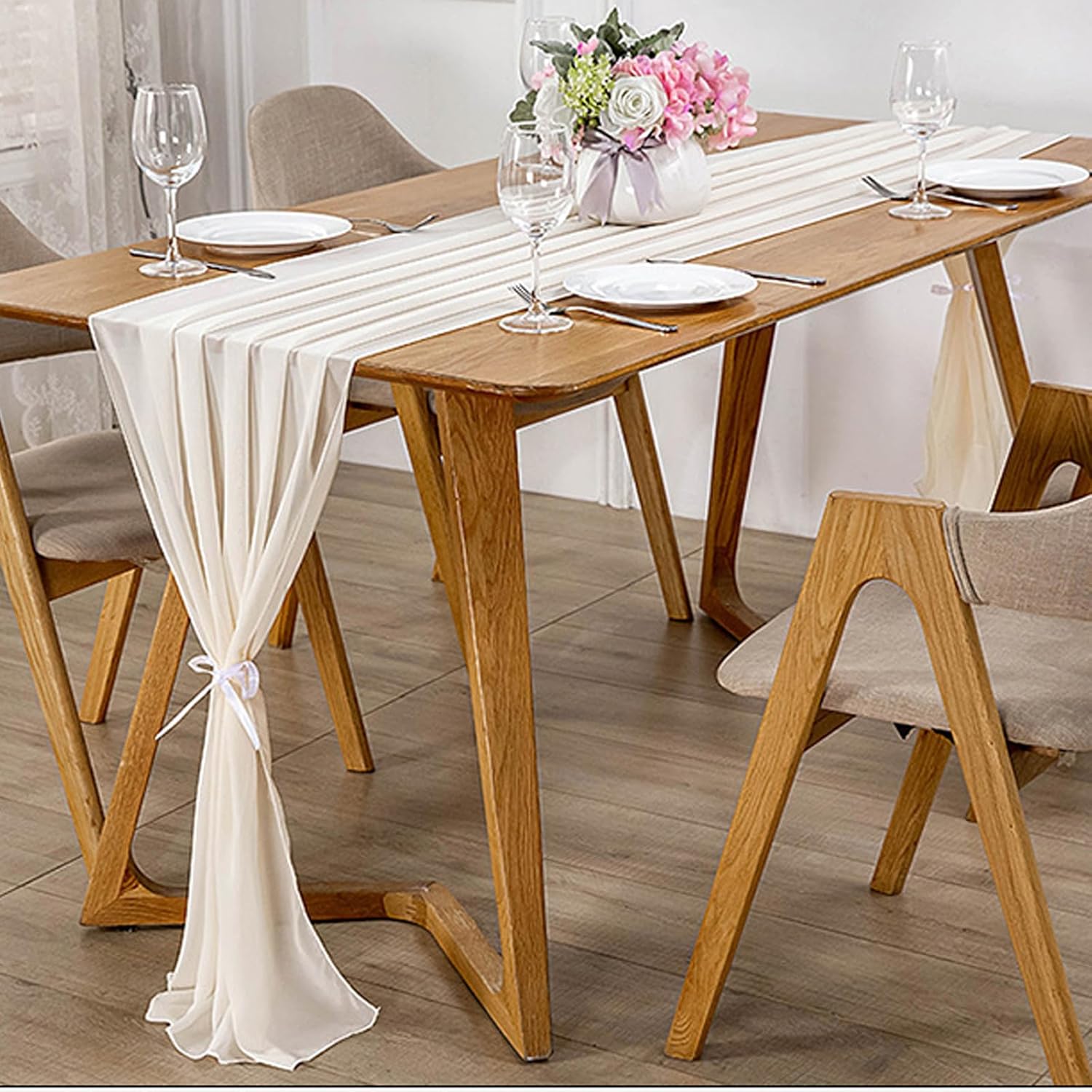 With our elegant chiffon table runners, it's easy to upgrade your occasion from casual everyday to a high-end luxury party atmosphere!High quality material Made from premium chiffon material, the table runners with satin ribbon creates a beautiful ruffle perfectly. It can also drape elegantly over your table and flows onto the floor in dreamy pools of fabricTransparency textureSoft chiffon table runners have the right amount of transparency to look romantic and elegant in the light, adding hazy romantic feeling to the tableFirm seams Our table runners are surrounded by delicate hand-stitched seams that are strong and reusableCare instructions Machine washable in a laundry bag, or hand wash in cold water with mild detergentThe versatile tablecloth can be used for any occasion, adding a sophisticated, dreamy, and beautiful touch to your life on every occasion. It can also be perfectly matched with decorations such as flowers, candlesticks and green plants.