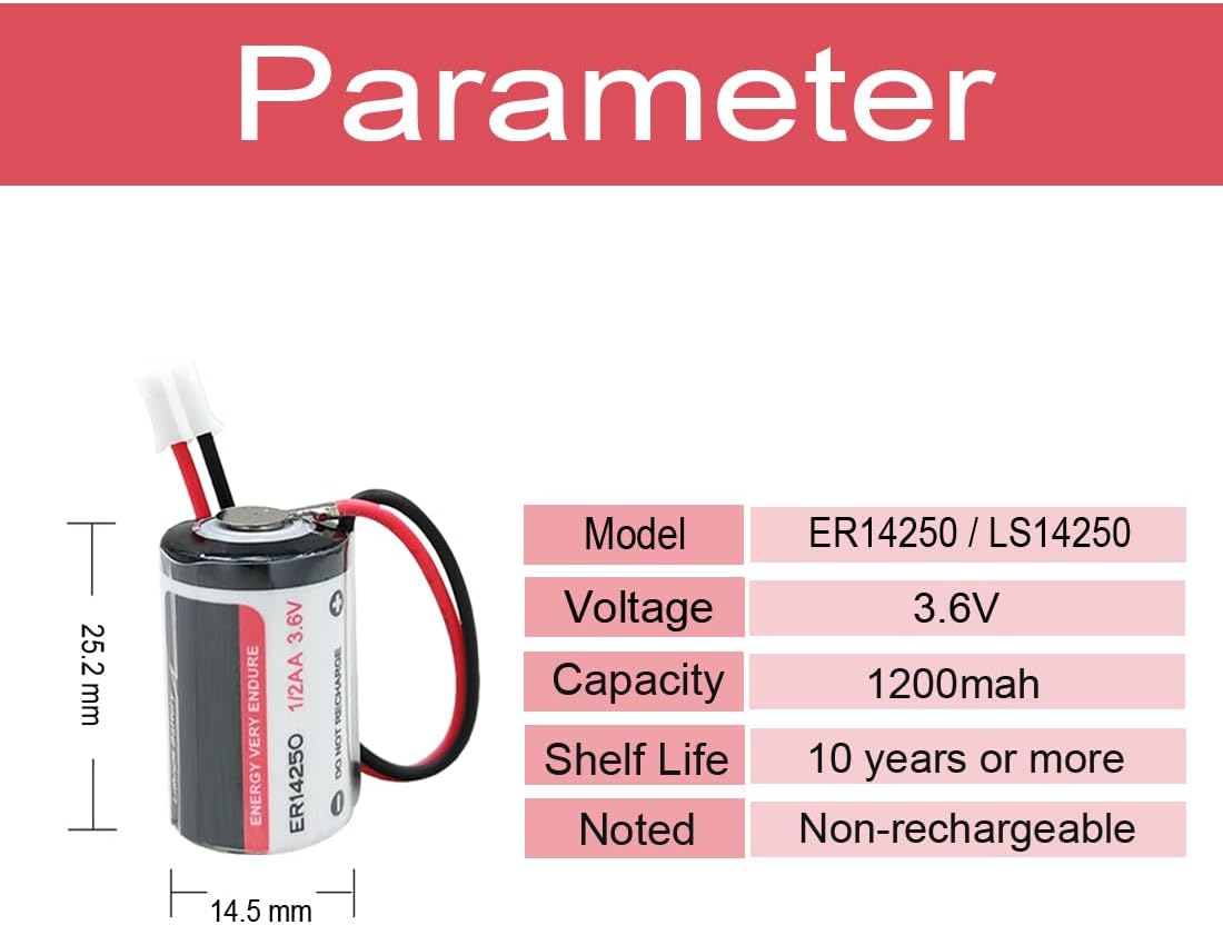 Why choose our battery? 1. Stable working voltage and good safety. 2. Low self-discharge rate gives this cell a 10 year shelf life. 3. Broad temperature range (-55°Cto +85°C). 4. High energy, high reliability. Parameter: Type of battery : lithium battery Voltage: 3.6 V Battery capacity: 1200mAh Dimensions: 25.20*14.50mm Battery size: 1/2 AA Battery weight: 10 g Rechargeable: NO,please don't charged it