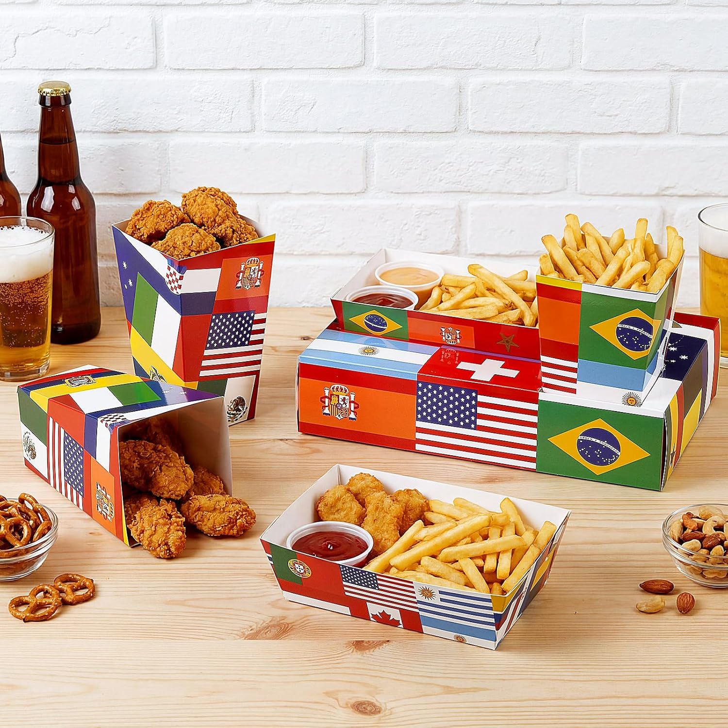 Features: Each food tray is decorated with the vibrant national flag of a participating team. This complete set meets all the needs for a fan gathering. It can hold snacks, popcorn, keep things neat and organized, and immerse you in the authentic atmosphere of a football match. It's the ideal way to transform an ordinary viewing party into an immersive experience full of team spirit, and every football fan will love it. The supplies feature classic movie themed designs, creating a festive atmosphere that enhances the overall party experience. Specifications: Main material: cardboard Main color: multi color Package includes: 36 x Combo trays 36 x Snack trays 36 x Popcorn boxes Notes: Manual measurement, please allow slight errors on size. The color may exist a slight difference due to different screen displays