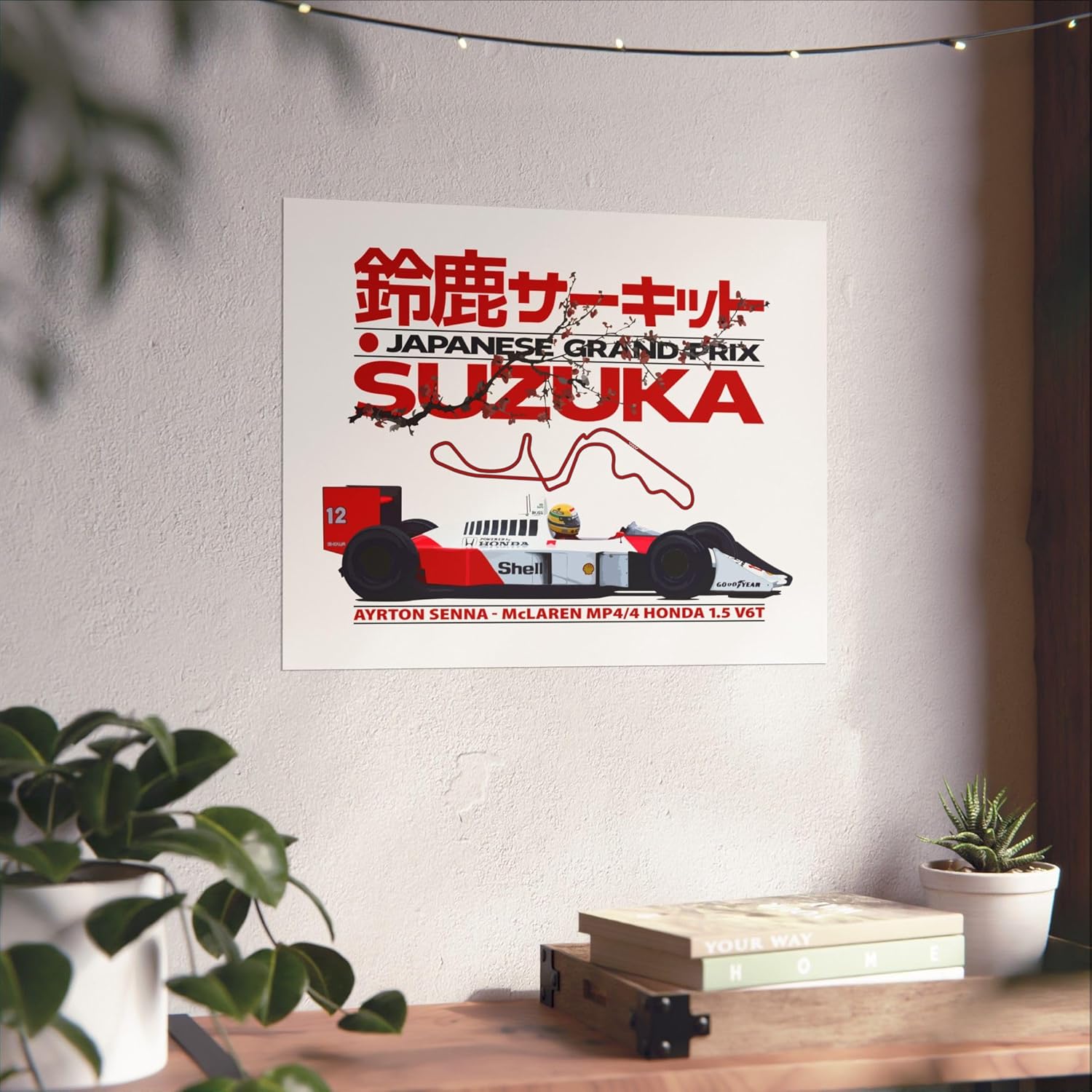 🏁 LIMITED EDITION – Only 100 pieces available! This limited edition poster celebrates one of the greatest drives in Formula 1 history — Ayrton Senna’s iconic victory at the 1988 Japanese Grand Prix, where he clinched his first World Championship title in unforgettable fashion. Held at the legendary Suzuka Circuit on October 30, 1988, the race began in dramatic fashion. Senna, starting from pole position, stalled on the grid and dropped to 14th place. But what followed was a legendary comeback as Senna, in his dominant McLaren MP4/4, surged through the field with unmatched precision and speed. As light rain began to fall, Senna’s legendary skill in wet conditions came alive. He caught and passed his rival and teammate Alain Prost, taking the lead and holding it until the checkered flag. With that win, Senna secured the first of his three Formula 1 World Championships and etched his name into the history books as a master of Suzuka. The poster captures this iconic moment with a refined Japanese-inspired design. Senna is depicted behind the wheel of the McLaren MP4/4, set against a clean white background, with a delicate cherry blossom branch above and the words "Suzuka Circuit" written in Japanese kanji. The color scheme — white, red, and black — reflects the traditional colors of Japan and adds a timeless elegance to the piece. Printed on 175 gsm matte fine art paper, this tribute to Senna’s 1988 Japanese GP victory combines motorsport legacy with refined visual storytelling. This is a Limited Edition of only 100 prints — a must-have for Formula 1 fans, collectors of racing art, and admirers of Ayrton Senna, the master of Suzuka. EU representative: HONSON VENTURES LIMITED, 3, Gnaftis House flat 102, Limassol, Mesa Geitonia, 4003, CY Product information: Generic brand, 2 year warranty in EU and Northern Ireland as per Directive 1999/44/EC Care instructions: If the poster does gather any dust, you may wipe it off gently with a clean, dry cloth.