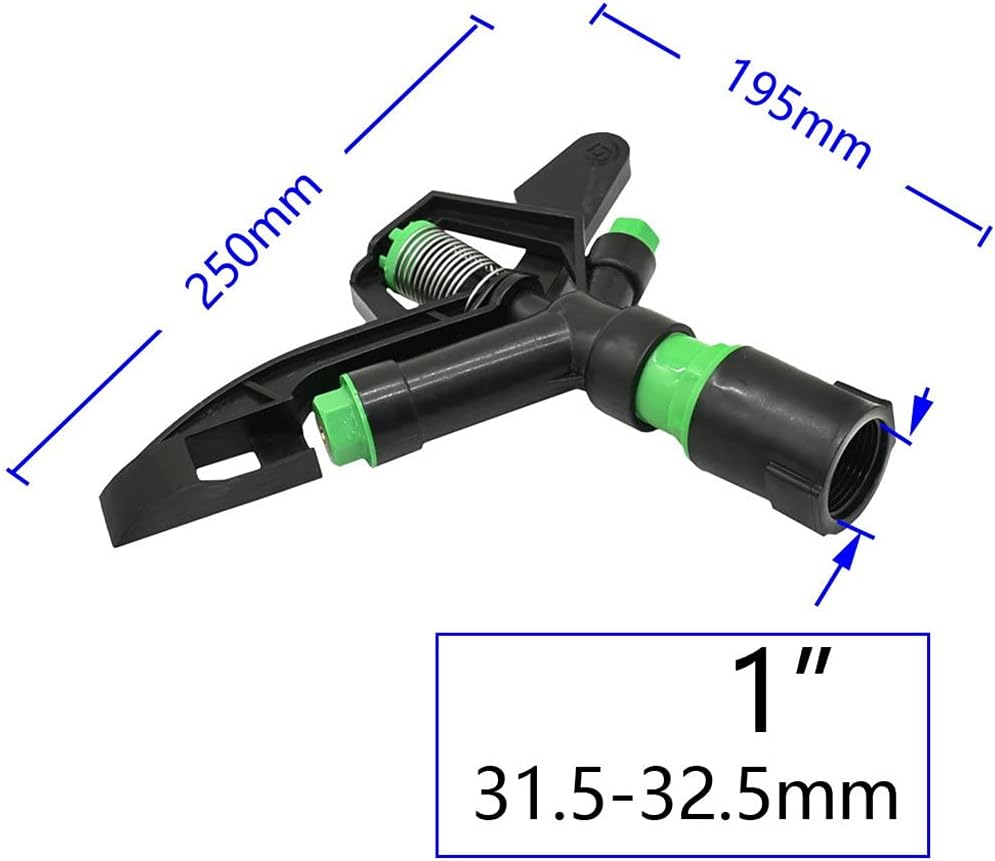 1 inch plastic lawn sprinkler.Scope of application:Agriculture, lawns, villas, industrial irrigation.Easy installation and good water saving performance.Connection size: 1", DN25, internal thread connection, diameter about 31.5-32.5mm. diameter: 15-28M.Working pressure: 4--6 kg.Water spray volume: 3.43-7.44 cubic meters/hour.Packing list:1 x Garden SprinklerNotice:Actual color may be slightly different from the image due to different monitor and light effect.Please allow 1-3cm deviation due to manual measurement.Due to manual measurement, please allow for a difference of 1-3 centimeters. Thank you for your understanding