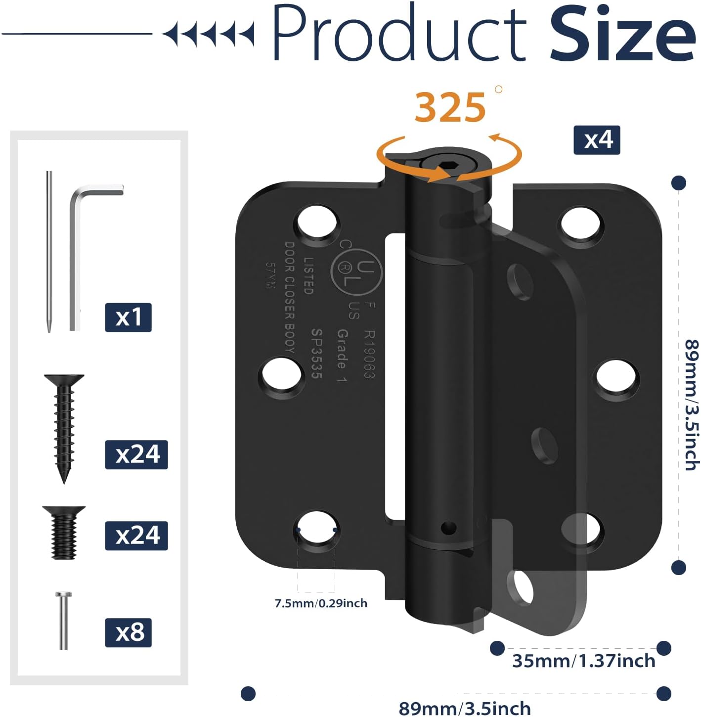 | Included Components | 4 Pack 3.5inch Self Closing door hinges |