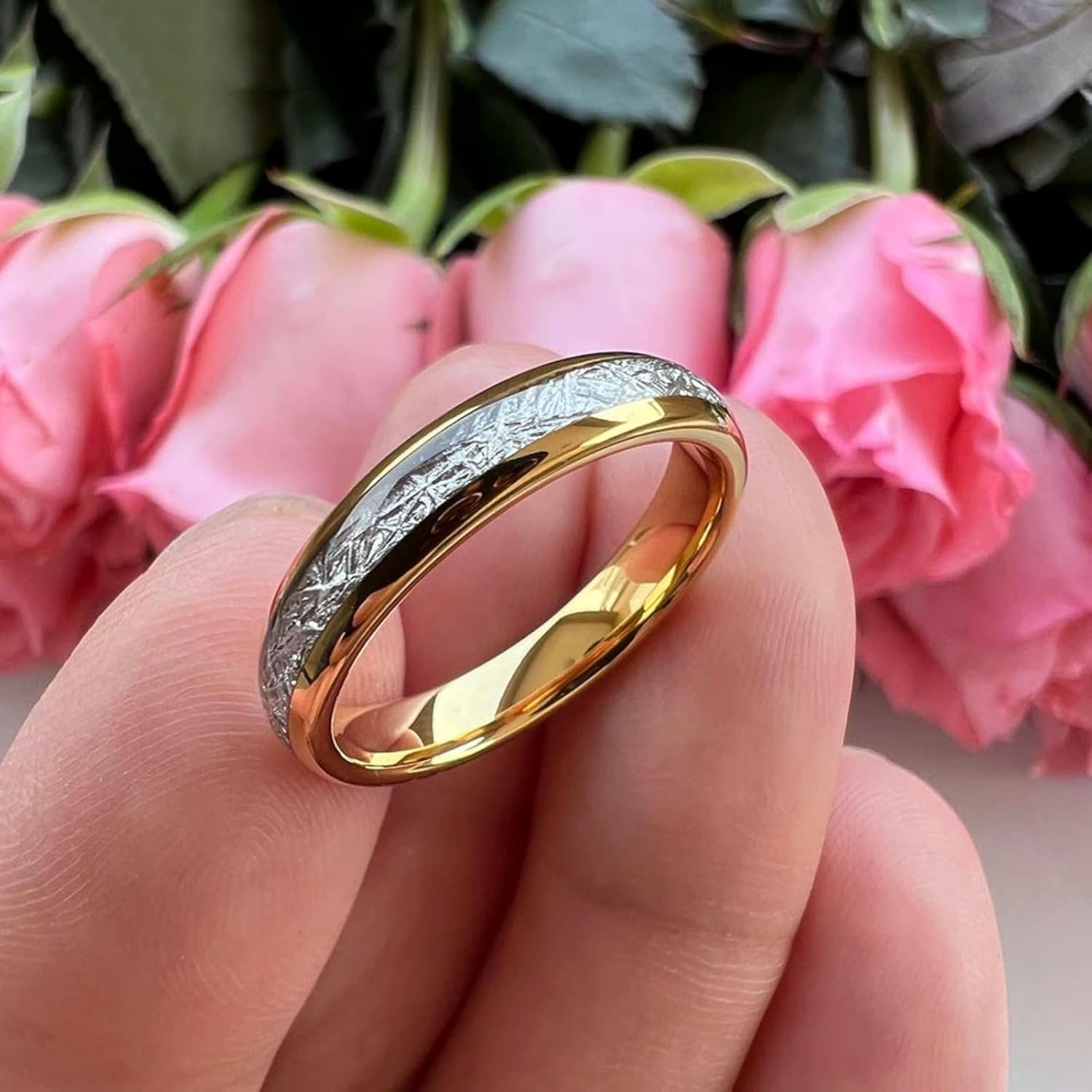 Surface Width : 4mm Rings Type : Wedding Bands Setting Type : Tension Setting Style : Cute/Romantic Material : Metal Shape\pattern : Round Gender : Unisex Metals Type : Tungsten Fine or Fashion : Fashion Occasion : Wedding Origin : Mainland China Color : Gold/Rose Gold/Silver Color Finish : Domed band&Polished shiny Inlay : Imitate Bright Meteorite
