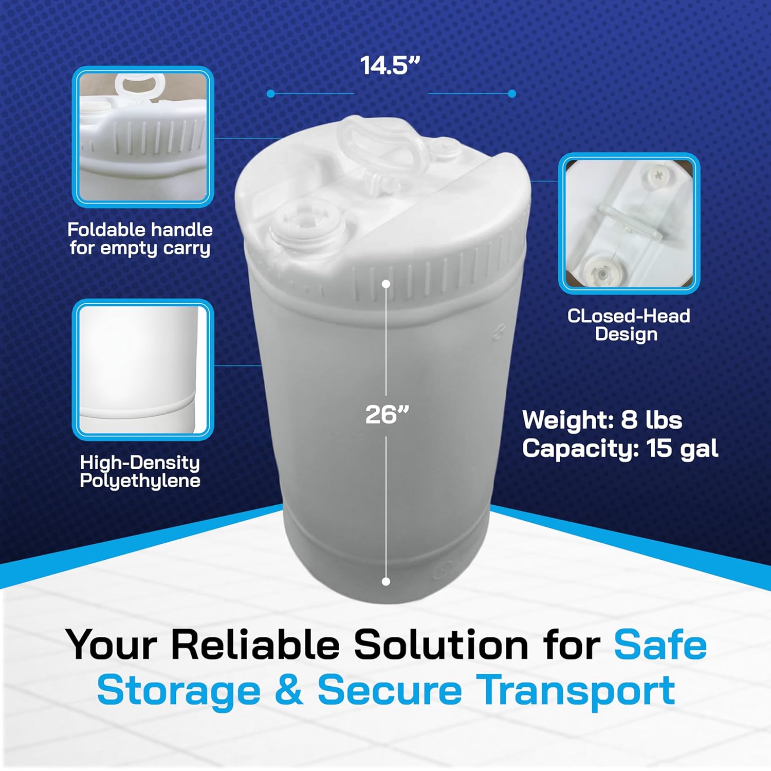 • MULTIPURPOSE CONTAINERS FOR VARIOUS USES. This 15-gallon drum is ideal for various uses, including industrial waste containers, food-grade storage with lids, and water storage containers. Built to meet diverse industry needs, these versatile drums ensure reliable and safe storage.