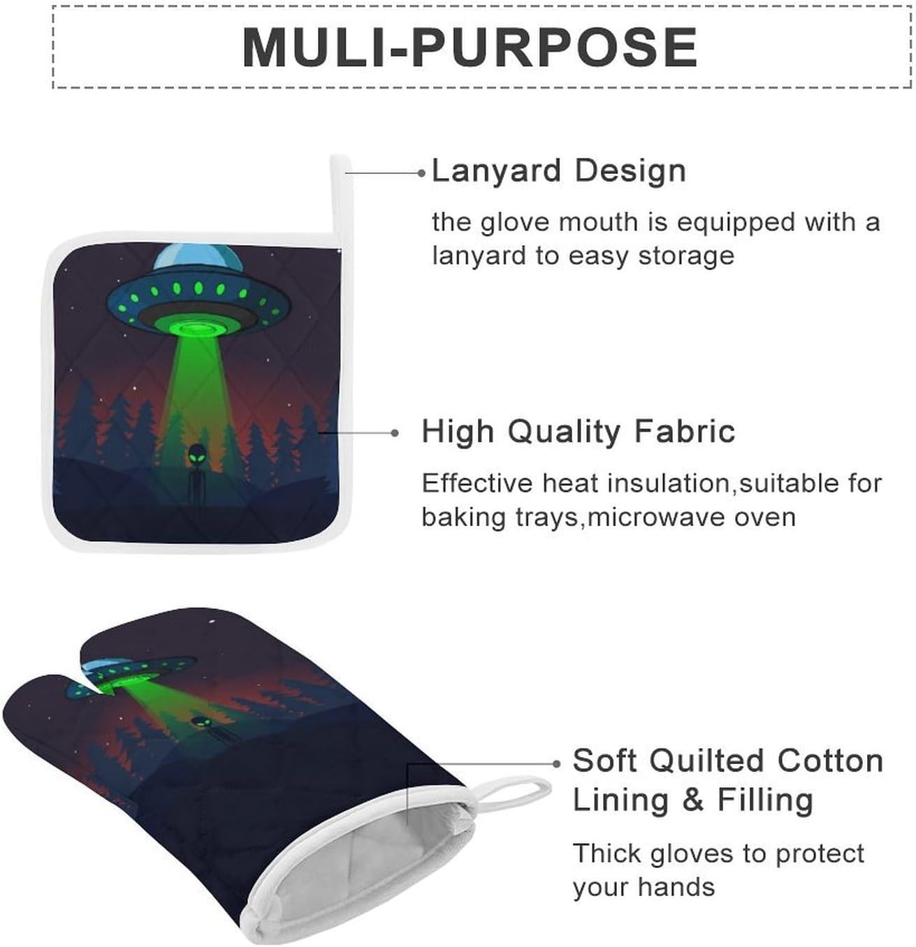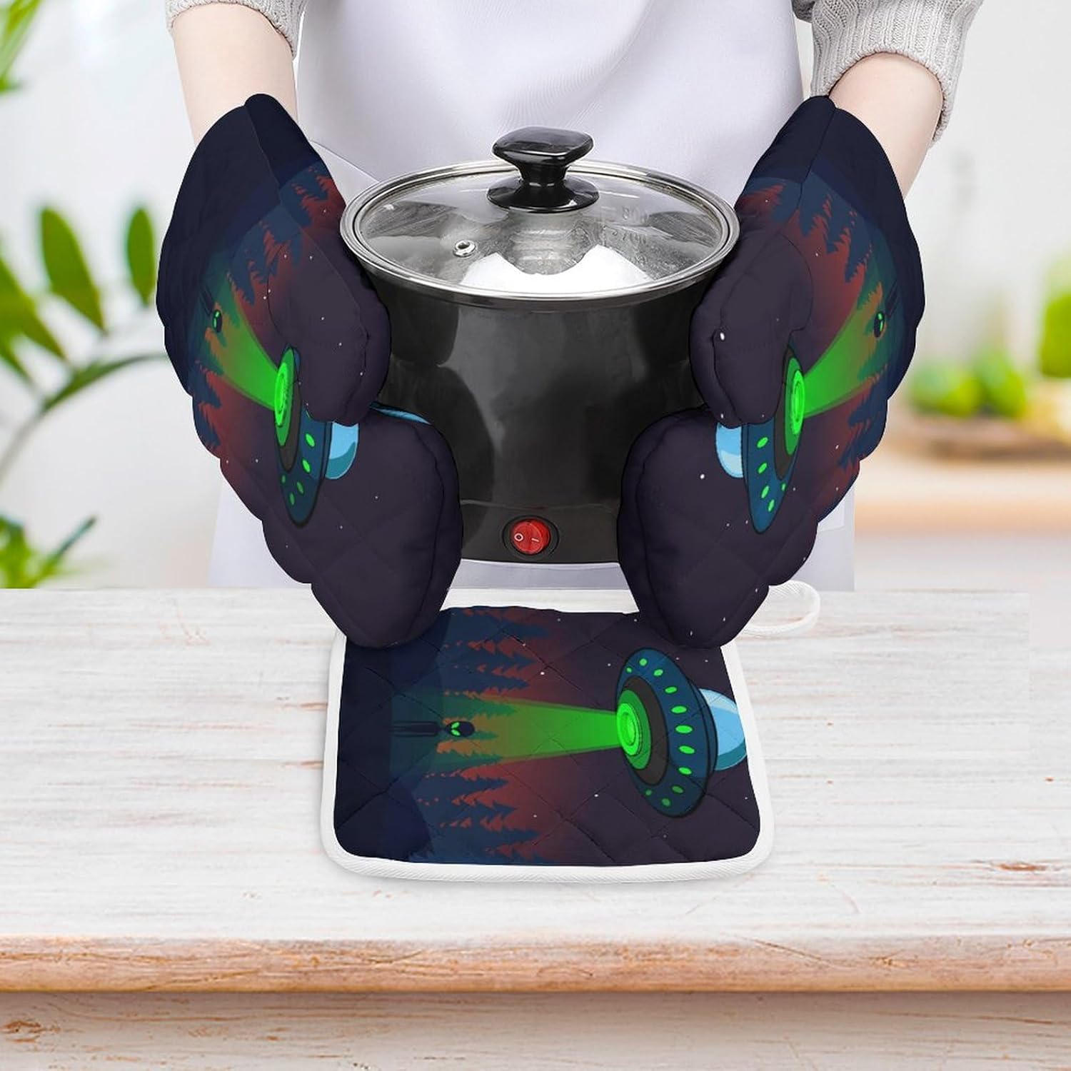This 3-piece oven mitt and pot holder set is made of washable and reusable fabrics and is suitable for use when cooking and baking in the kitchen such as hot pots, barbecues, and microwave ovens.