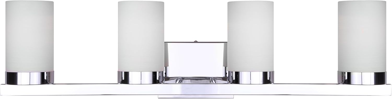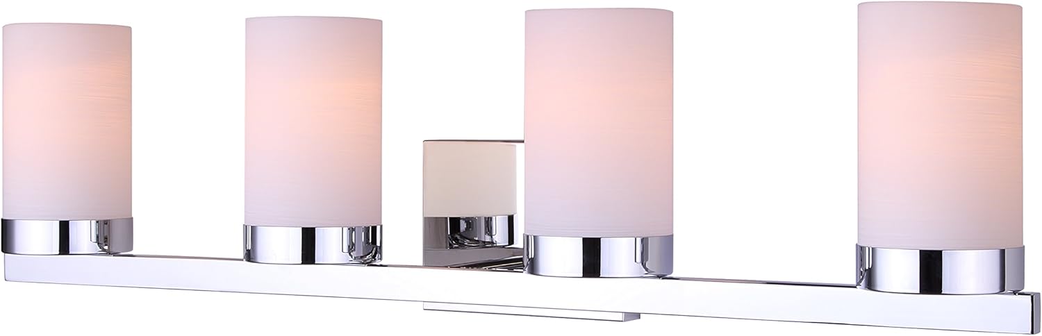 CANARM Style Milo IVL429A04CH 4 Light Vanity Light - The Milo collection in chrome with flat opal glass features a combination of straight-line contemporary design with in-line cylindrical shades that soften the look. Uses 4 100W A bulbs (Not included). EASY CONNECT push-in connection system. Canarm has a long and successful history of supplying lighting and ceiling fans. They work diligently to create a comprehensive selection of styles and designs as well as maintaining high standards of product quality and value.