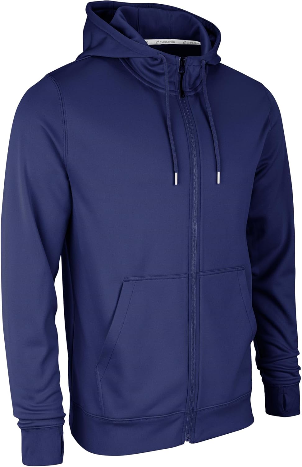 Fleece, 100% polyester fabric body; Traditional zip up hoodie, flat tape drawcords with rubber dipped ends; 3 piece hood, set in sleeves; Thumbholes in stretch poly rib cuffs; Stretch poly rib bottom hem; Enamel zipper with Champro logo puller;