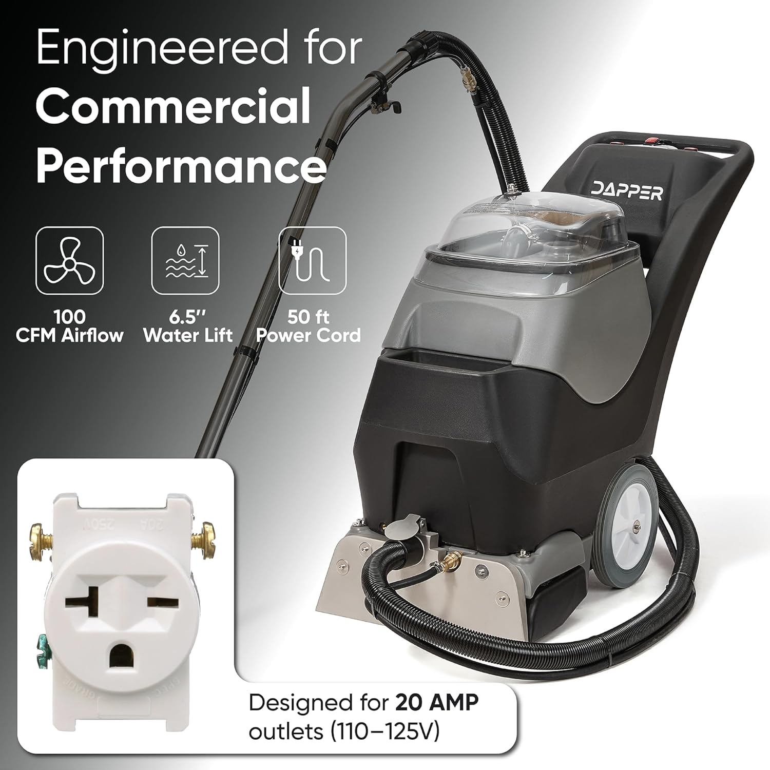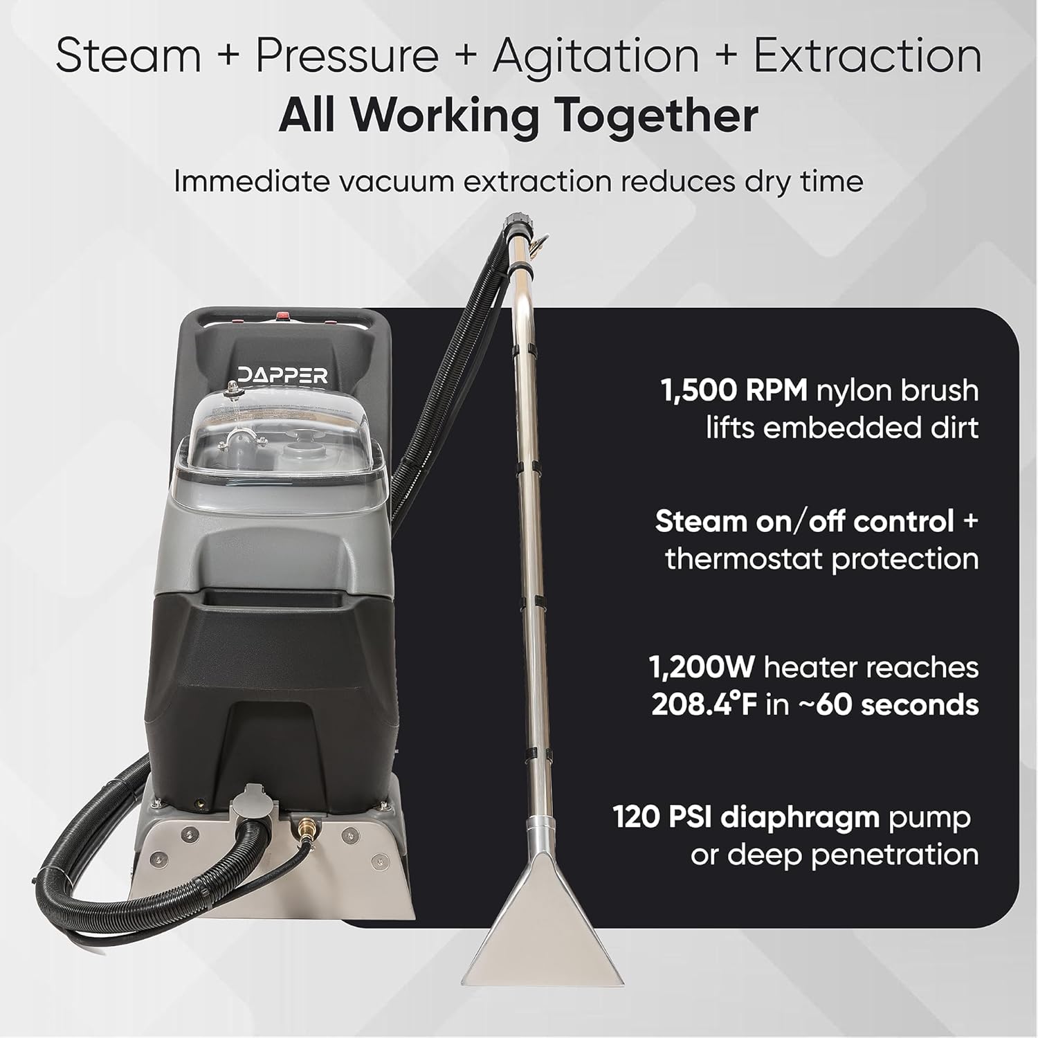 This commercial 4-in-1 carpet extractor steams, sprays, scrubs, and extracts in one pass for true deep cleaning performance. The integrated 1,200W heater reaches up to 208.4°F in about one minute to help loosen heavy soil, while the 120 PSI diaphragm pump delivers consistent solution pressure. A 1,500 RPM nylon brush agitates fibers as the vacuum system recovers dirty water immediately, reducing dry time and improving results. Powered by a 20 AMP, 2,500-watt system on 110–125V with a 50 ft power cord, this unit is built for standard commercial outlets. The 18.5" cleaning path covers large areas quickly, delivering 100 CFM airflow and 6.5" water lift through a 1.5" vacuum hose for strong extraction. For versatility, switch from walk-behind mode to detail cleaning using the included 10 ft hose, 3.5" upholstery tool, and 9" extension wand—ideal for stairs, furniture, edges, and tight spaces. Large 10.5 gallon solution and 8 gallon recovery tanks support up to 15,000 sq ft of productivity with fewer stops. Backed by the Dapper Warranty with 2 year parts and labor, U.S.-based support, and nationwide technician service.