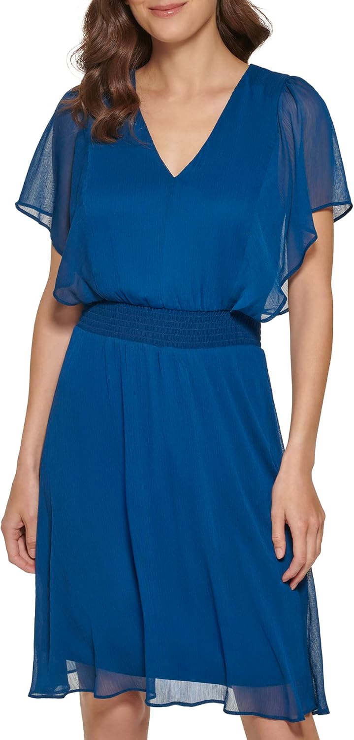 This DKNY Women's wear to work v-neck dress is a chiffon smocked waist short length, flutter sleeve