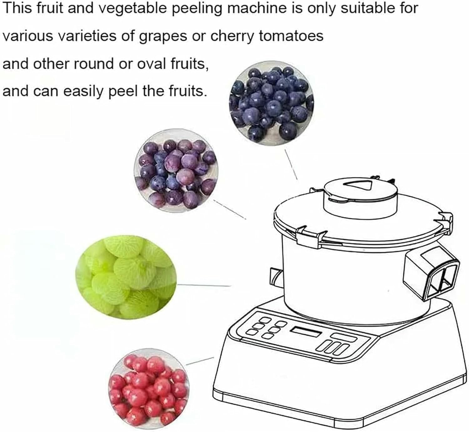 【Product advantages】 This fruit and vegetable peeling machine is an efficient, convenient and safe fruit peeling equipment, suitable for various round and oval small fruits such as grapes or cherry tomatoes. The rotating cutter separates the fruit skin from the pulp, allowing you to peel the fruit easily. 【advantage】 *The maximum duration of a single work is 600 seconds. *5-edge cutter head, diameter 207.6mm. *Pure copper motor, high-speed rotation, quick peeling. *Adjustable rotation direction (forward/reverse), speed, and time. *6 speeds adjustable: 1100-1800RPM. *The cylinder is transparent and visible, and the processing process is clear at a glance. *This machine is mainly suitable for various grapes and cherry tomatoes, and is also suitable for other small round or oval melons. 【Product parameters】 Name: Commercial Grape Peeling Machine Power: 85W Blade diameter: 207.6mm Speed: 6 gears Output: 500g/min Size: 30*33*30cm Packing size: 35*40*35cm Net weight/gross weight: 4.2kg/7kg Purpose: snack food factory, fruit processing factory, commercial catering, winery, beverage factory, cannery, frozen food factory, others 【Package List】1* Electric Grape Peeling Machine