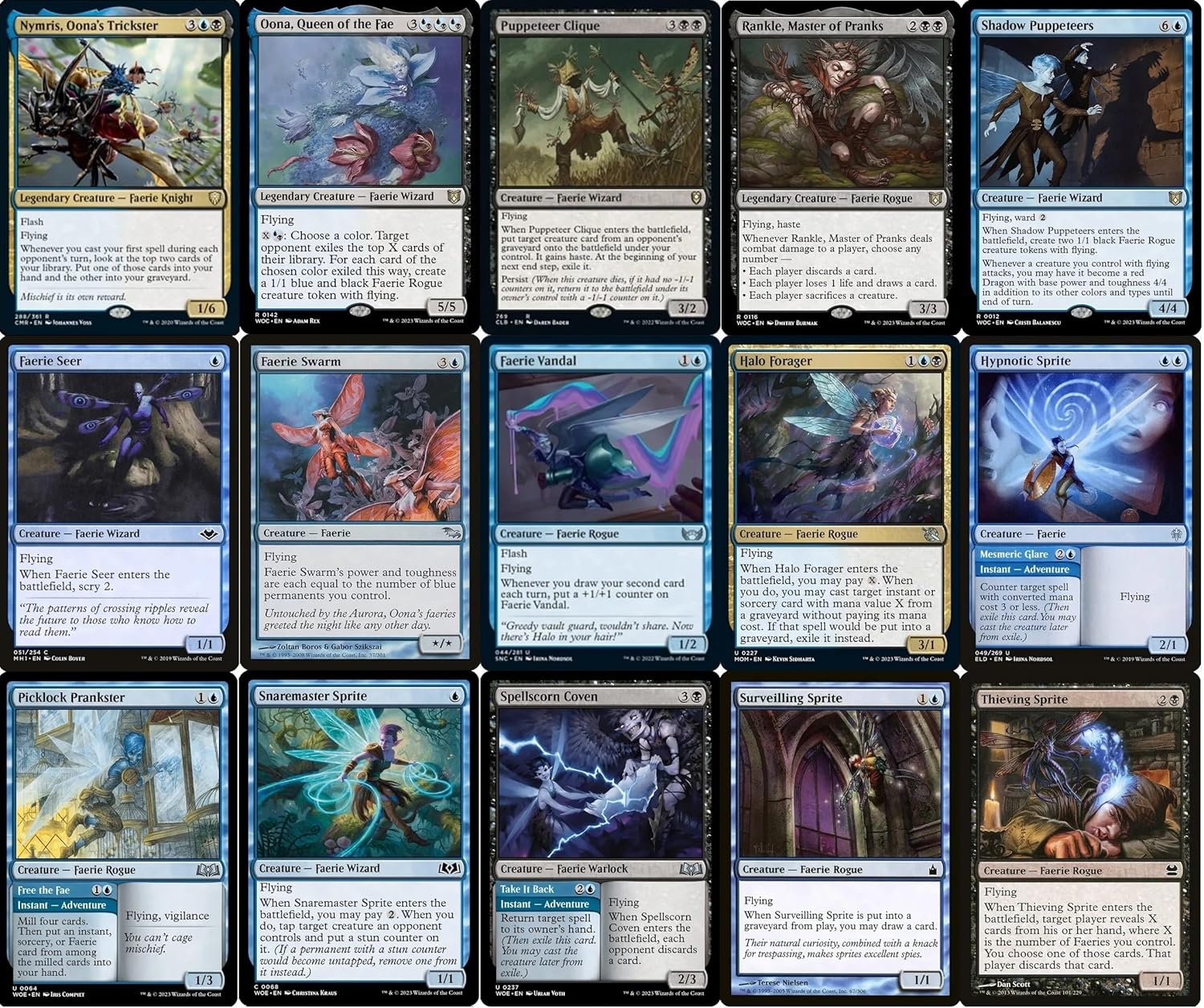 This is a 100 card, elite commander dimir (blue/black) dimir faerie deck. This deck is an absolute blast to play. At the helm of this deck is Alela, a potent commander that can generate a massive faerie token army and goad opponents’ creatures. The deck then features a number of strong faerie creatures. These mischievous and elusive creatures are your mainstay, capable of swarming your opponents and controlling the board. These include powerful and evasive creatures such as Faerie Formation (faerie tokens, card draw), Glen Elendra (buffs your entire army), Tegwyll (card draw, army buff), and many more! The deck then adds strong counterspell and removal effects to interact with your opponents’ most potent threats including Counterspell, Negate, Didn’t Say Please, Crippling Fear, Go for the Throat, Faerie Fencing, etc. Powerful artifacts and enchantments have a variety of strong synergies with your faeries. Cards such as Icon of Ancestry buff your team. Arcane Signet, Mind Stone, and Sol Ring provide acceleration that allow you to cast your creatures ahead of curve. This is a highly versatile deck that can quickly threaten your opponents with damage, meanwhile generating value through card draw effects and removing your opponents biggest threats. This deck is PERFECT for anyone looking to play a fun, new, themed deck. This deck is remarkably powerful and features a number of powerful creatures and synergies. This deck has been play tested and is remarkably strong, not to mention a ton of fun to play!