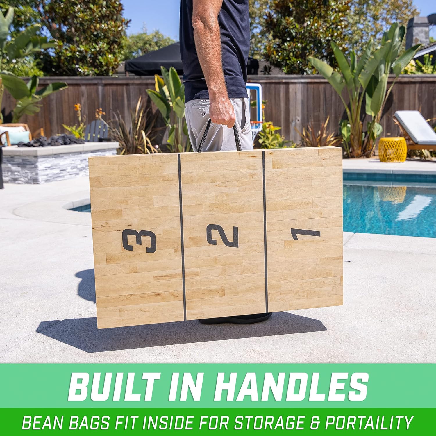 GoSports Tossski Shuffleboard Bean Bag Toss is a new and exciting game that combines the classic fun of shuffleboard with the added twist of cornhole style gameplay! Each team starts with a total of 4 bean bags and players take turns tossing the bean bags down the game board to slide as far as possible without going off the back. Players must decide to go for a high score versus blocking or knocking each other's bags off the board making for competitive fun! The full set includes one 6 foot x 2 foot wooden Shuffleboard Bean Bag Toss board and 8 slide impact bean bags. The game board measures 6 feet by 2 feet and is made of solid wood with a veneer finish to mimic traditional shuffleboard slides. The board folds out instantly for game play and can be folded closed with the bean bags inside for storage with carrying handles making the game ultra portable and ready for your next tailgate, beach day, cookout and more!.