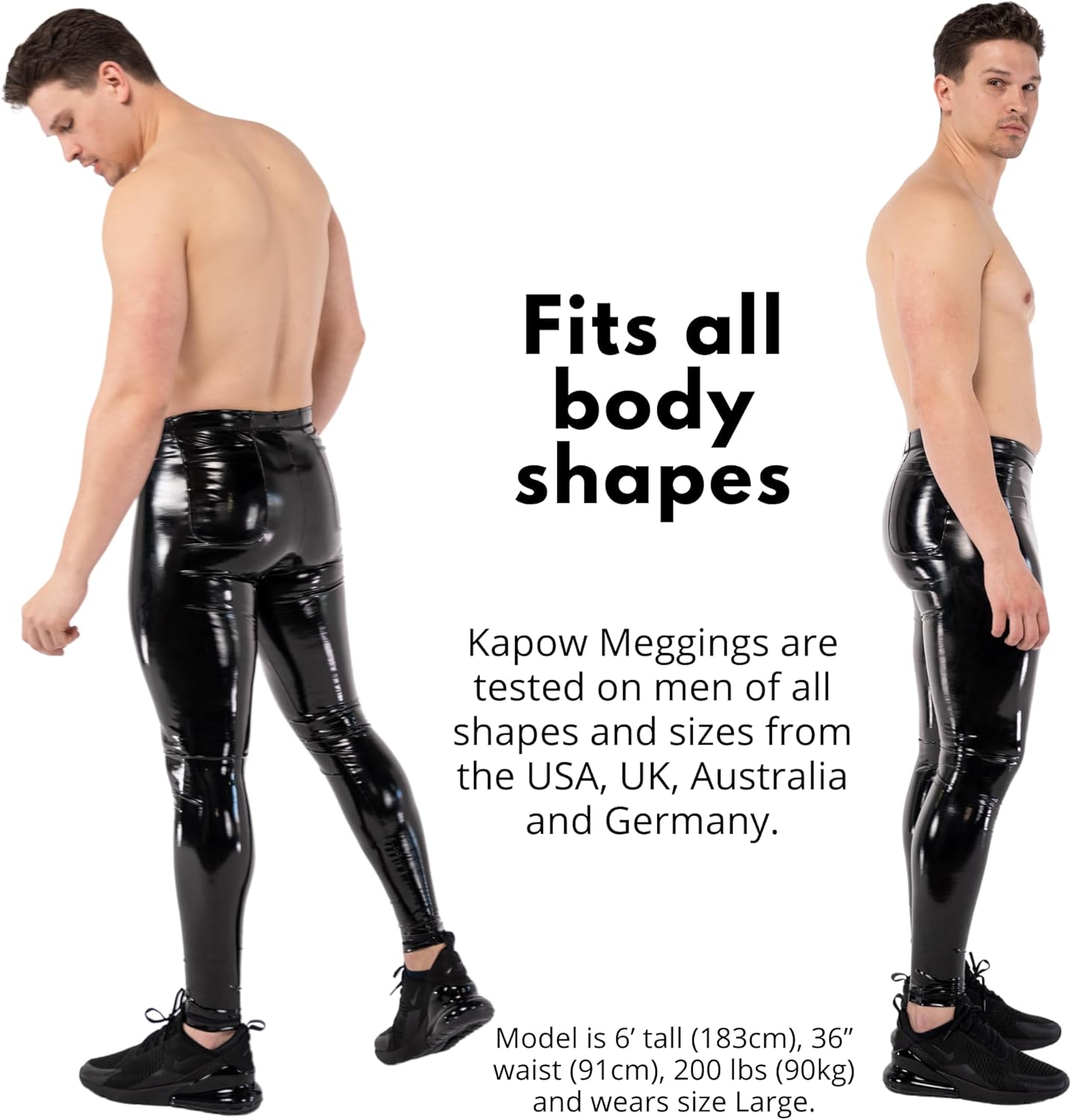 Kapow High Gloss Vinyl Men’s Leggings are designed to turn heads and redefine men’s fashion with a bold, super shiny “wet look” finish. Made from premium high-gloss vinyl fabric, these leggings deliver a sleek liquid shine that ensures you stand out. The high-stretch, form-fitting design hugs your body like a second skin, offering a snug yet comfortable fit. Featuring a non-squeak PU-coated recycled polyester/spandex blend, these leggings are durable, lightweight, and eco-friendly, with 92% of the fabric made from post-consumer plastics. Designed with an ergonomic waistband for a secure, comfortable fit, they sit slightly above mid-rise to prevent “butt pull” when bending or moving. The flat seams ensure a smooth, non-abrasive feel, making them perfect for all-day wear. Whether you’re hitting the gym, rocking a festival, lounging at home, or elevating your street style, these leggings provide unmatched comfort and flexibility. The two hip pockets add practicality, while the adjustable drawstring lets you customize the fit. Tested on men with different body types worldwide, Kapow leggings are engineered for ultimate comfort, movement, and style. Worn by rock stars, athletes, dancers, and everyday legends, they are the perfect fusion of fashion and function. For a tight, form-fitting look, order your regular size, or size up for a looser fit. Whether you’re making a statement or simply upgrading your wardrobe, Kapow High Gloss Vinyl Men’s Leggings deliver confidence, style, and performance in one striking package.