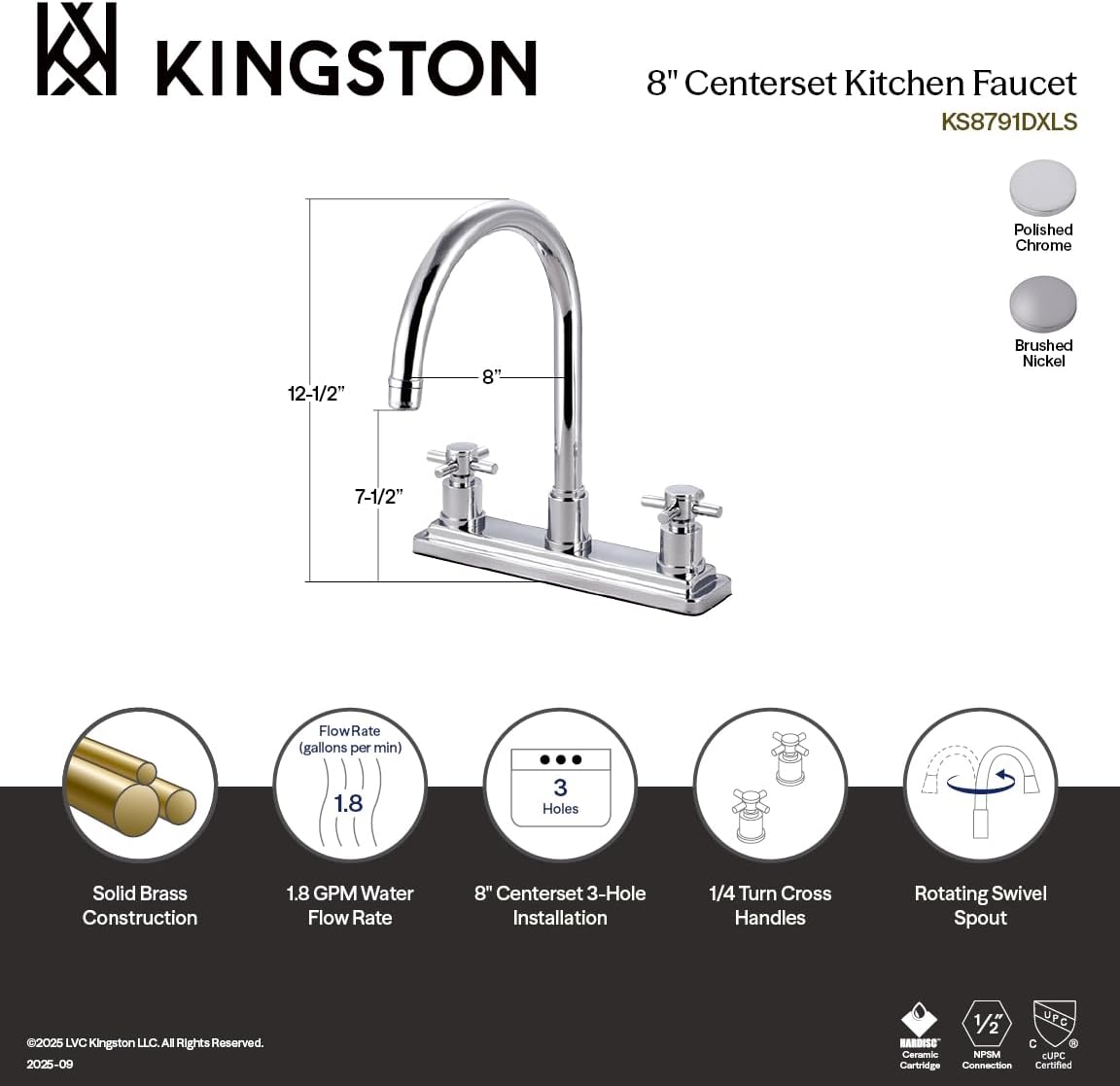 Product Description Kingston Brass KS8798DXLS Concord Twin Lever Handles 8" Kitchen Faucet, Satin NickelTwo Handle Deck Mount, 4 Hole Sink Application, 8" Centerset, Fabricated from solid brass material for durability and reliability, Premium color finish resist tarnishing and corrosion, 360 degree turn swival spout, 1/4 turn On/Off water control mechanism, 1/2" - 14 NPS male threaded inlets, Ceramic disc valve, Max 1.8 GPM/6.8 LPM at 60 PSI California and Vermont Restricted, Integrated removable rator, 8" spout reach from faucet body, 12 1/2" overall height, Ten Year Limited Warranty to the original consumer to be free from defects in material and finish.Kingston Brass KS8798DXLS Concord Twin Lever Handles 8" Kitchen Faucet, Satin Nickel Features: Sprayer Not Included Satin Nickel Finish Max 1.8 GPM/6.8 LPM At 60 PSI. California and Vermont Restricted 1/4 Turn Ceramic Disk Cartridge Concord Cross Handle 8" Center 10" Spout Reach* Image shown may vary by color, finish, or material From the Manufacturer Two Handle Deck Mount, 4 Hole Sink Application, 8-Inch Center set, Fabricated from solid brass material for durability and reliability, Premium color finish resist tarnishing and corrosion, 360-Degree turn swivel spout, 1/4 turn On/Off water control mechanism, 1/2-Inch-14 NPS male threaded inlets, Ceramic disc valve, 2.2 GPM (8.3 LPM) Max at 60 PSI, Integrated removable aerator, 8-Inch spout reach from faucet body, 12-1/2-Inch overall height, Ten Year Limited Warranty to the original consumer to be free from defects in material and finish.