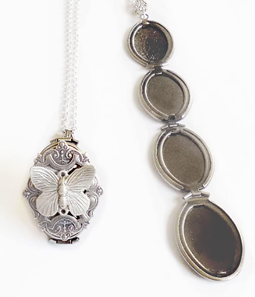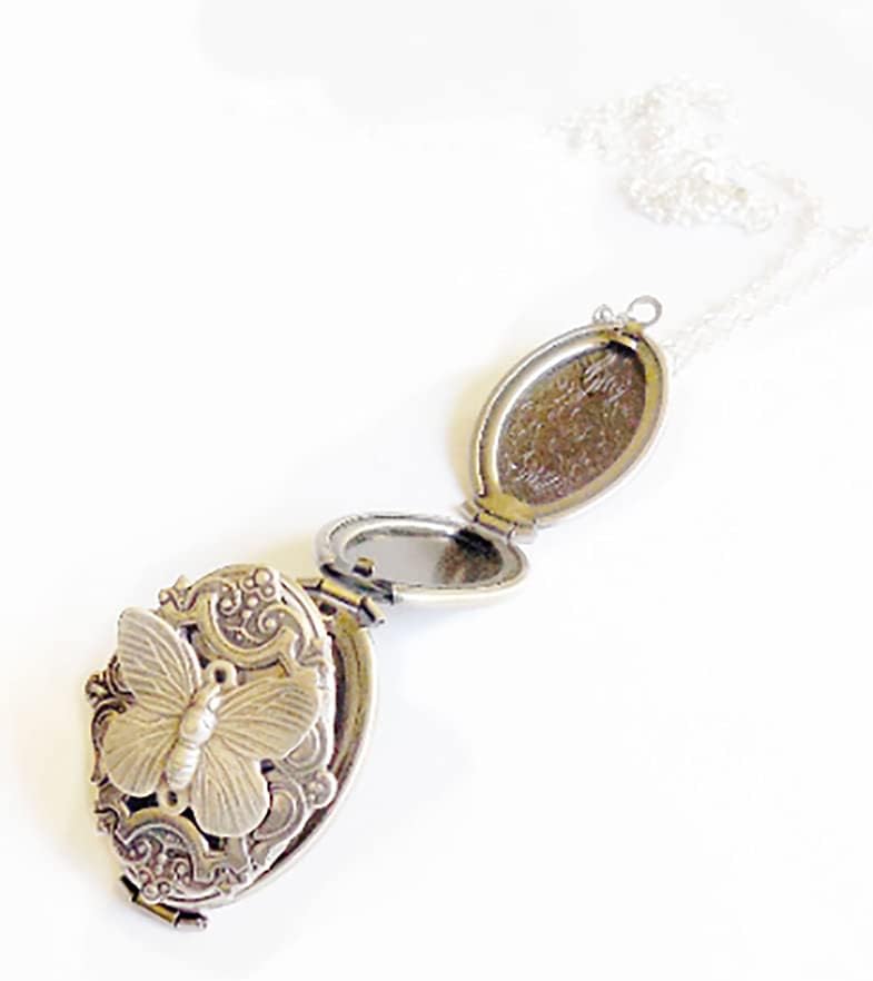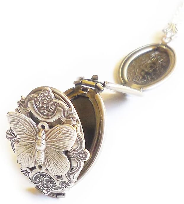 The antique-style silver plated floral engraved locket is 35mmx20mm. The antique-style silver pattern is the back of this locket. The locket is oval in shape and has a lace filigree edging that frames the outside.