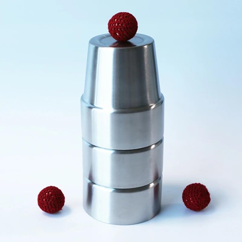 Three small balls placed under three metal cups magically jump from cup to cup, vanish completely and reappear again under the magician's control! The perfect cups for this classic effect. Cups and Balls set is hand-spun from aluminum and designed with a larger load capacity than most. Each cup measures 3.8 inches tall and 3.3 inches in diameter at the mouth. The balls are about 2 cm/0.78 in in diameter. 【PACKAGE INCLUDE】3 regular cups, 4 crochet balls.