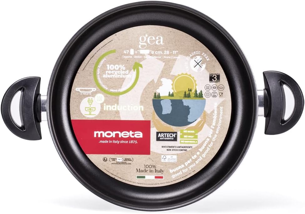 Recycled aluminium body from cans suitable for contact with food. Artech non-stick inner coating, free of pfoa, nickel, bpa and heavy metals. Bakelite anti-scald handle. Suitable for all hobs, including induction.