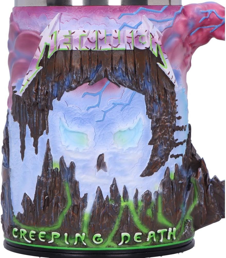 Celebrate the legendary Metallica single with the Metallica Creeping Death Tankard, an officially licensed tribute to the iconic Ride the Lightning album. This stunning tankard showcases a detailed wrap-around design inspired by the haunting imagery of the Angel of Death and the biblical plague. Crafted from high-quality resin, it features vibrant hand-painted details that capture the dark intensity of the original artwork. Designed for both display and practical use, it includes a removable stainless steel insert for easy cleaning. Packaged in a Metallica-branded gift box, made from 100% recyclable cardboard, this tankard is an addition to any fan's collection or an unforgettable gift for heavy metal enthusiasts. Raise your horns and toast to the legacy of Metallica with this bold, eye-catching drinking vessel.