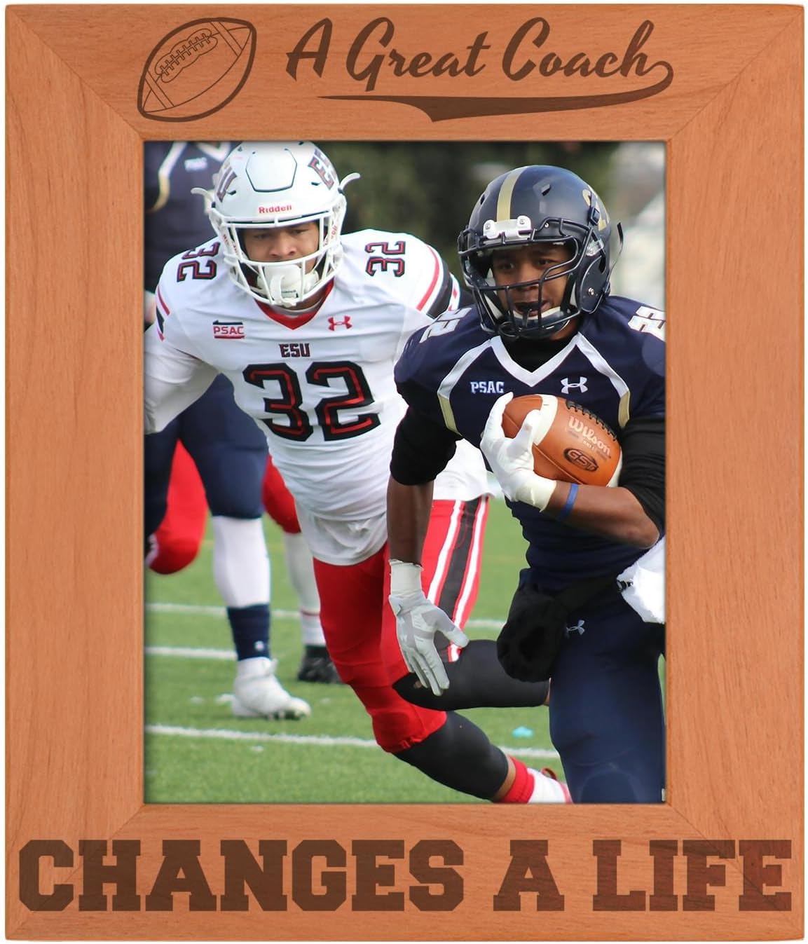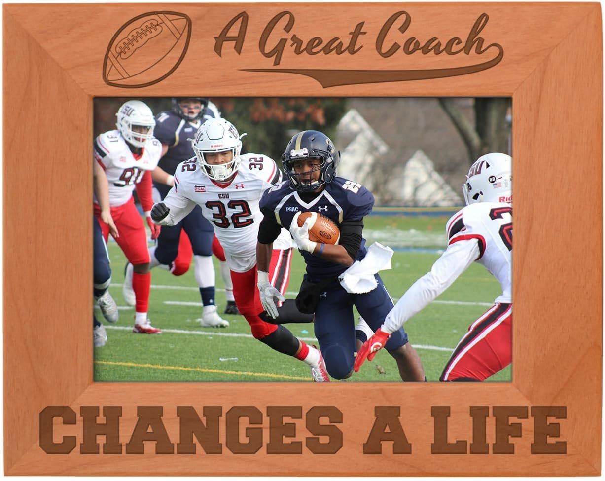 Elevate your favorite memories with this premium laser‑engraved wood photo frame, crafted from real, sustainably sourced wood for a warm, natural look that complements any home décor style. Designed for versatility, this picture frame is available in three popular sizes—4x6, 5x7, and 8x10—and supports both horizontal and vertical orientation to suit any photo, artwork, or keepsake. Each frame includes a clear glass front for crisp viewing, plus built‑in hardware and an easel back for easy wall mounting or tabletop display. Because every frame is made from genuine wood, natural variations in grain and color make each piece truly unique. This timeless wooden frame is ideal for living rooms, offices, bedrooms, and entryways, and makes a thoughtful gift for holidays, weddings, graduations, and everyday celebrations. A durable, stylish choice for showcasing life’s most meaningful moments. Never miss a moment of the action with a frame that makes a perfect football dad or football mom gift to show off those team photos.