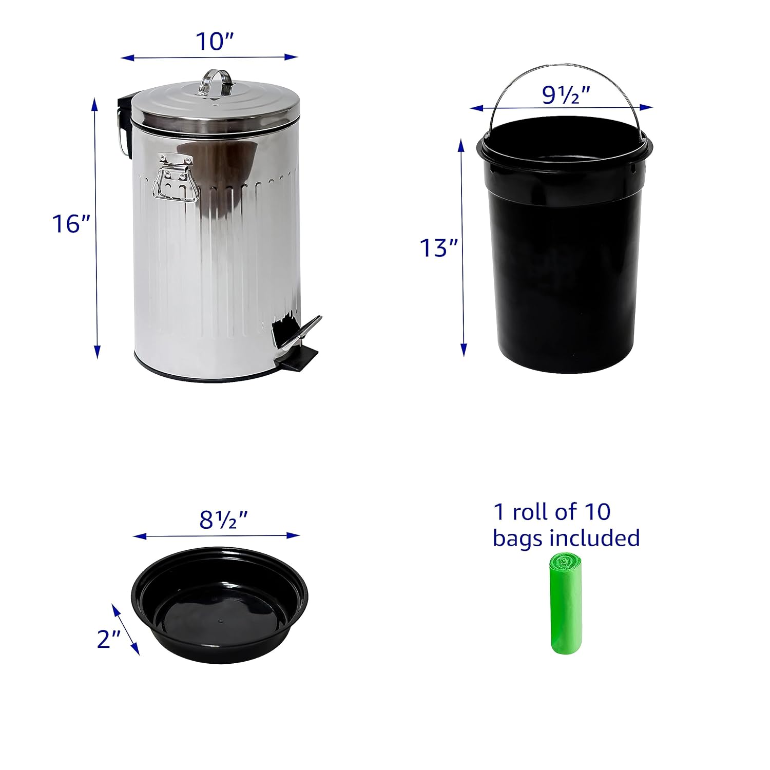Bundle contains Indoor/Outdoor 16" Tall Steel Wastecan with Foot Pedal (hard plastic liner, 1 bag roll, and bag storage bowl included), along with our extended handle poop scoop with rake, and a 3 pack of refills for the bags.
