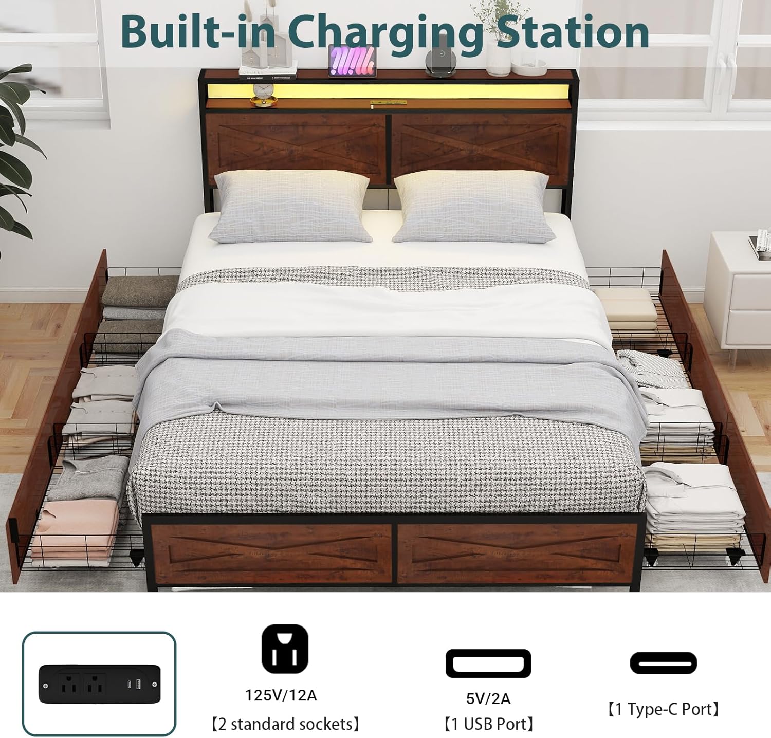 Specifications: Material: Wood, Metal Color: Reddish Brown Features: 6 Storage Side Drawers, Charging Station, LED Light Size: Queen Size