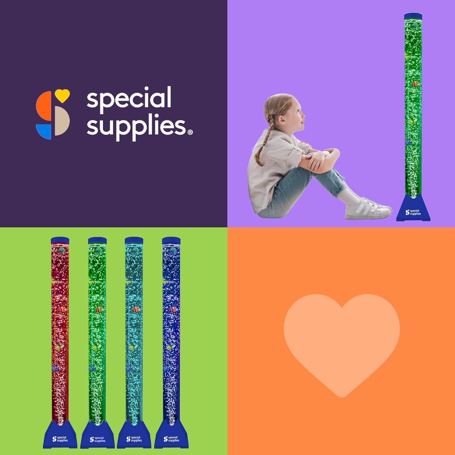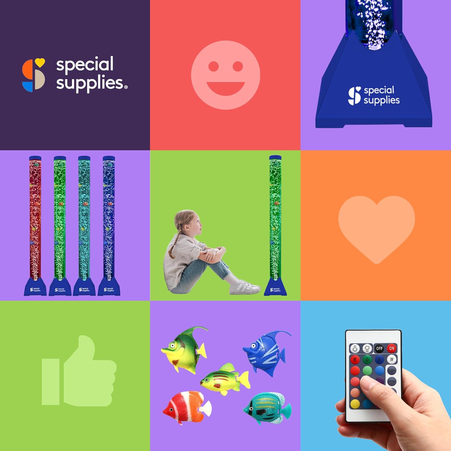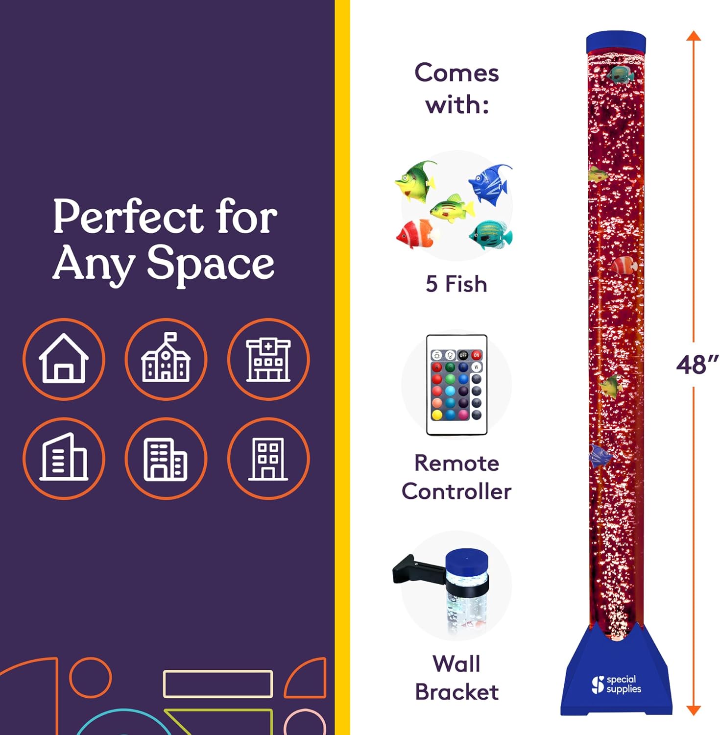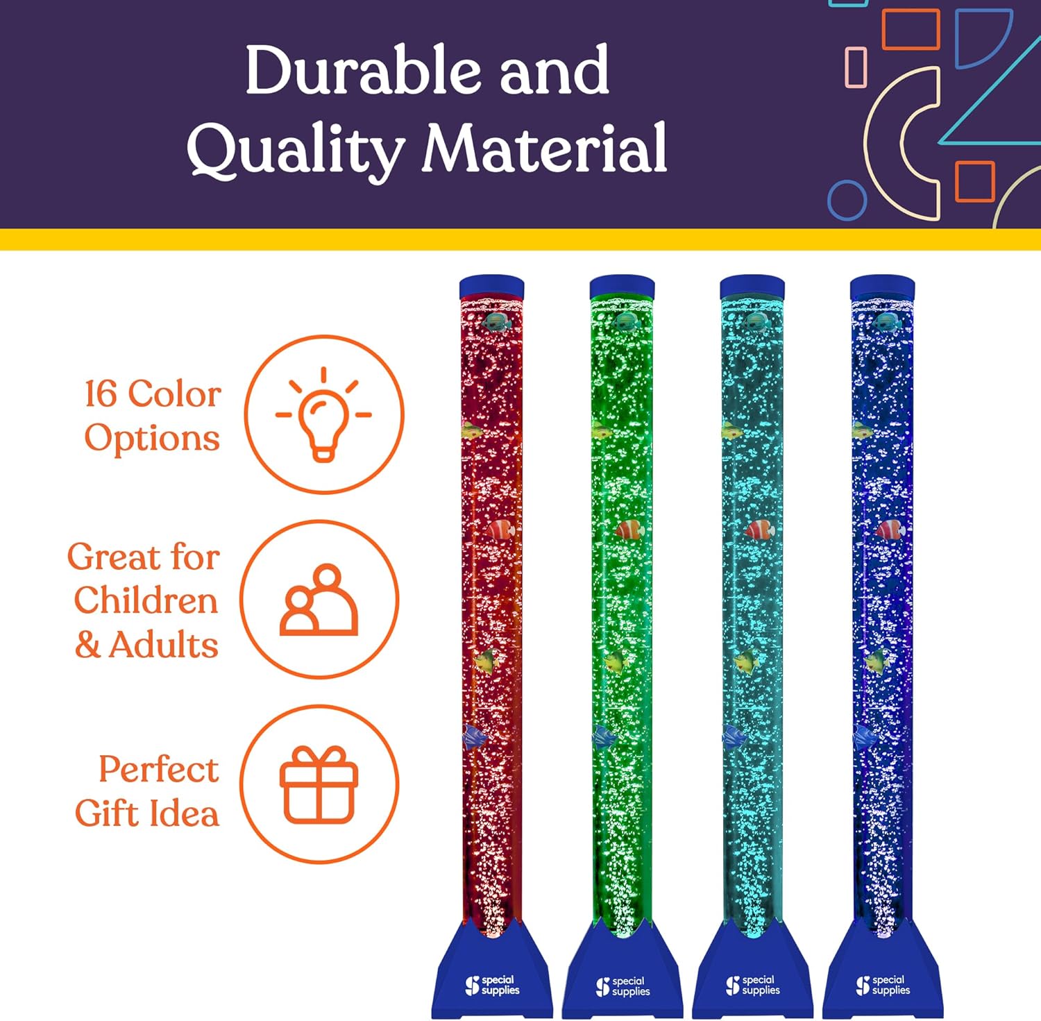 Help ease overwhelming emotions and refocus restless minds and bodies with a fun, colorful, and engaging sensory bubble lamp with free-floating fish from Sensory Supplies. The more we learn about sensory disorders the more we’re evolving in the way we help children accept and manage them. And that’s an especially important process when it comes to giving them outlets that help them relax, refocus, and find balance when they need a calming environment. We created the Special Supplies Aquarium Sensory Bubble Tube as a unique and innovative way to add warmth and relaxing ambiance to your child’s room, while also soothing those very specific needs at the same time. Designed as a tall, free-standing floor lamp but with the addition of colorful, fast-moving bubbles and adorable fish that swim gracefully up and down, these sensory aquariums can help improve mood, restore well-being, and even support those who simply need a way to escape into their own fantastical world the moment the light comes on and the bubbles (and fish) start to dance. Product Details:Sensory Bubble Tube Fish Aquarium 16 Vivid LED Colors and 4 LED Lighting Effects 8 Decorative Plastic Fish User-Friendly Remote Control Pre-Assembled Tube Design Adjustable Wall Bracket Installation Hardware 5.9’ Power Adapter Cord Add soft-glowing lighting to your child’s room or play area with a sensory aquarium bubble tube filled with adorable fish that swim their way up and down through the bubbly, mesmerizing colors.