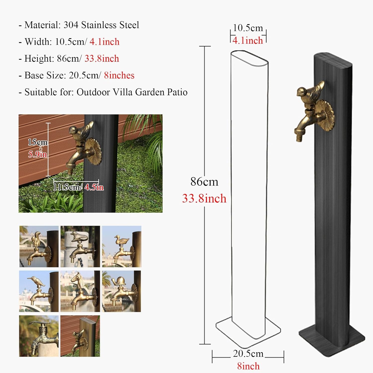 Anti-rust Courtyard Water Faucet Pillar:Enhance your outdoor space with our premium outdoor pillar water faucet. Crafted from durable 304 stainless steel with built-in frost-resistant insulation, this faucet is designed to last through all seasons. The intricate faucet designs cater to various preferences, adding a touch of elegance to any outdoor setting. With its sturdy square base and included accessories, installation is effortless, making it suitable for outdoor entrances, gardens, and scenic areas. This versatile pillar is available in vintage brown, black, or silver, and measures 10.5cm in width, 86cm in height, with a base size of 20.5cm. Perfect for outdoor villa gardens and patios, this faucet pillar combines durability, aesthetics, and convenience, making it the ideal choice for all your outdoor water supply needs. Features of our outdoor pillar water faucet include durability to withstand harsh weather conditions, accessibility for easy gardening and outdoor tasks, versatility for various outdoor water needs, and low maintenance requirements. Designed to prevent freezing in colder climates, this faucet also helps conserve water while providing years of reliable service. Easy installation makes it a perfect choice for DIY enthusiasts. Package includes 1 x Faucet Water Column. Note that there may be a 1-3 cm error due to manual measurement and some chromatic aberration due to lighting differences. Experience the ultimate outdoor water solution with our premium outdoor pillar water faucet.