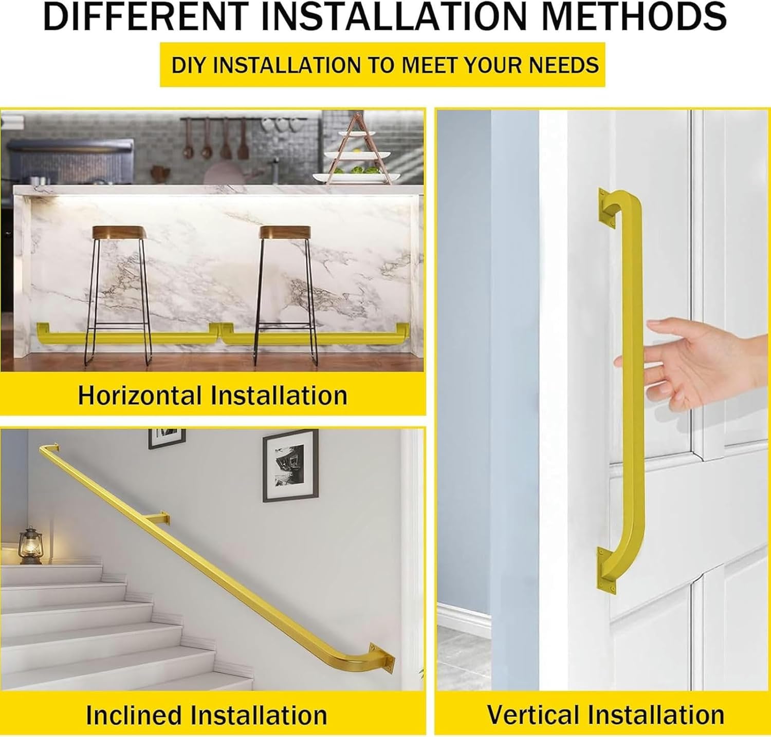 This modern wall mount wrought iron stair railing is suitable for many kinds of commercial places such as home, hotel, hospital, kindergarten, garage, underpass, restaurant, office building, etc. It can also be used as indoor and outdoor, attic, villa, garden, balcony, kitchen, corridor safety support rod, bar foot rail, bathroom hand rail, bathroom towel rack, toilet rail, dance studio grab rail, balcony plant stand, etc. It can better decorate your home, It is also an essential choice for you to provide more security protection for your family!——SpecificationMaterial: Wrought IronColor: GoldLength: 30cm-600cm (1inch-20inch)Square tube width: 3cmDistance from the wall: 7cm➤Note:Due to different light or display pixels when shooting, please allow slight color difference.Be sure to take measurements ahead of time before installation.——Quick installation: screw-in. And use expansion plugs to secure to wood, vinyl, brick, stucco, or concrete walls.