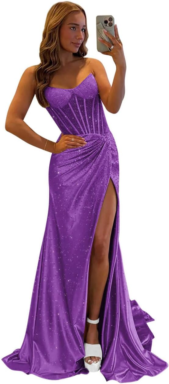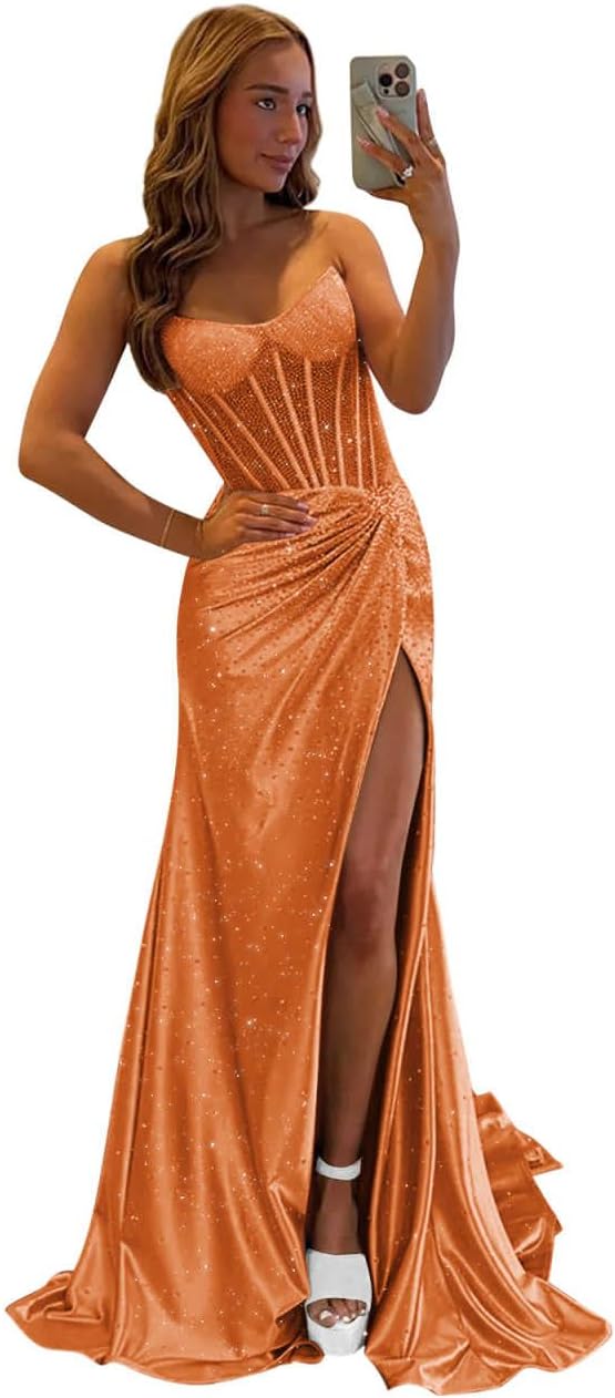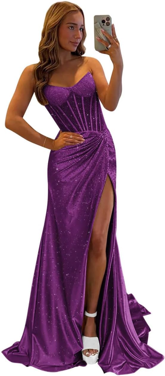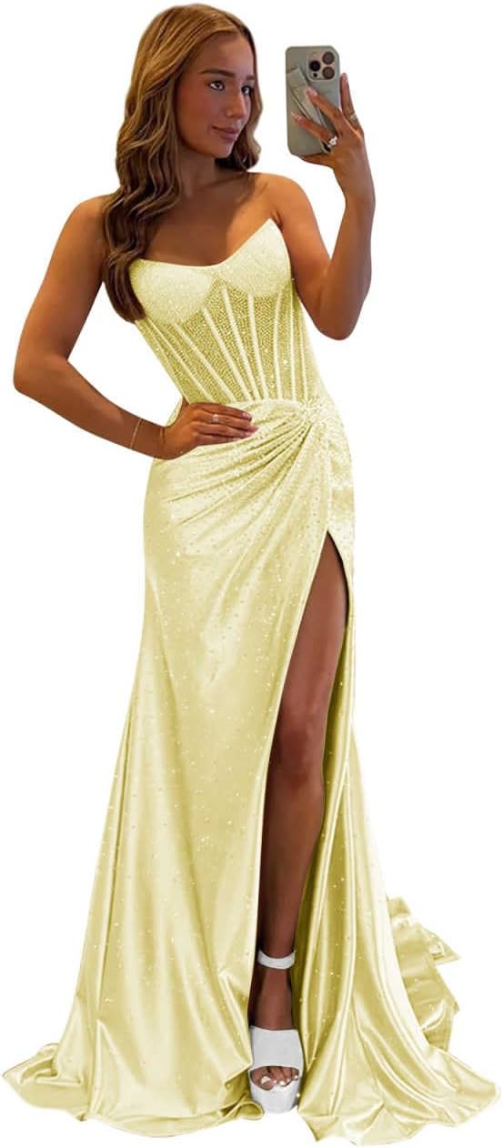| Occasion Type | Backless Sequin Birthday Dress, Mermaid Wedding Guest Dress, Satin Sequin Prom Dresses for Teens, Sequin Ball Gowns for Women Formal, Strapless Formal Dresses with Slit |
