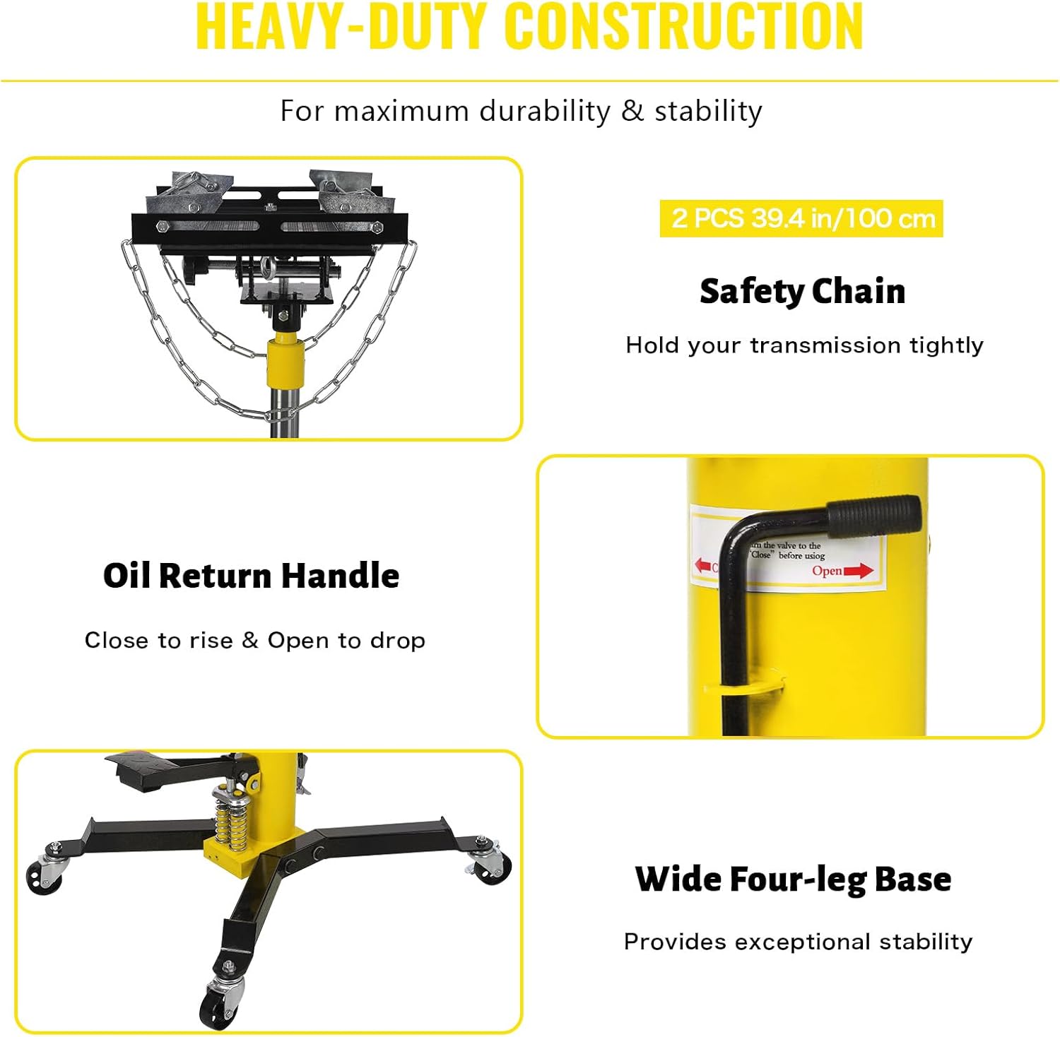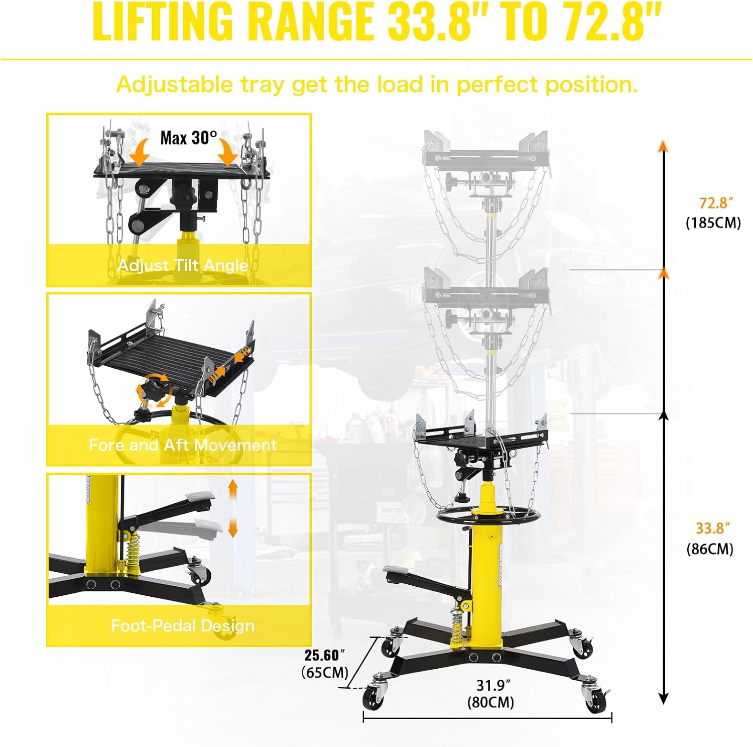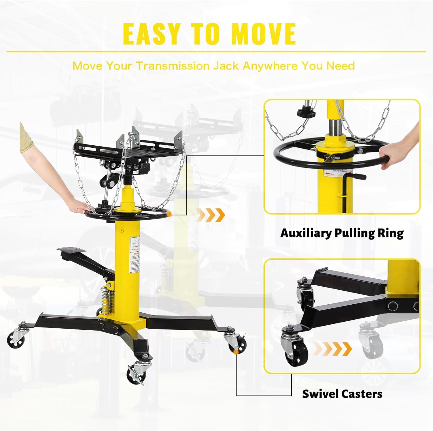 ### Product DescriptionUpgrade your garage or shop with our state-of-the-art Transmission Jack, designed to make your automotive projects easier and more efficient. With a robust 1100lbs (1/2 Ton) capacity and a versatile 2-stage adjustable hydraulic lift, this telescopic transmission jack is perfect for both professional mechanics and DIY enthusiasts.#### Key Features:- **1100lbs Transmission Jack**: With a capacity of 1100lbs (0.5 Ton), this transmission jack ensures secure and precise handling of transmissions, making installation or removal of car or light truck transmissions a breeze. An indispensable tool in any industrial setting.- **Adjustable High Lift Range (33.8''-72.8'')**: Our high-lift transmission jack features a hydraulic lift design, adjustable from 33.8 inches to 72.8 inches, catering to various applications. The foot pedal allows for easy adjustment, enabling you to work comfortably whether standing or sitting. Lowering the jack is as simple as turning the handle.- **Easy Mobility and Locking Mechanism**: Equipped with 4 swivel casters that rotate 360°, this high-lift jack stand can be effortlessly moved to any location. The central auxiliary ring design facilitates easy pushing and pulling of the jack. For added safety, the wheels can be locked to prevent movement during operation.- **Durable Construction**: Built with high-quality materials, this transmission jack is designed to withstand heavy use in demanding environments, ensuring long-lasting performance and reliability.Transform your garage or shop into a professional-grade workspace with our 1100lbs Capacity 2 Stage Adjustable Hydraulic High Lift Transmission Jack. Order now and experience the convenience and efficiency of a premium transmission jack!**Keywords**: Transmission Jack, 1100lbs Capacity, 2 Stage Adjustable Hydraulic Lift, Telescopic Transmission Jack, Foot Pedal, High Lift Jack, 360° Wheel, Lift Hoist, Garage, Shop.
