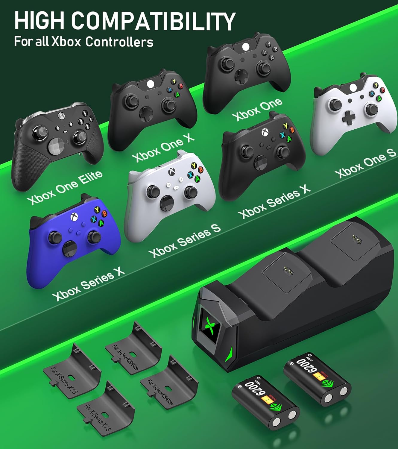 • Compatible for All Your Xbox Controller: The controller charger dock for Xbox one batteries pack is designed for Xbox One, Xbox One X, Xbox One S, Xbox One Elite, Xbox Series X, Xbox Series S. The charger and battery kit for Xbox controller is equipped with 4 controller battery back cover, 2 for X1/X/S/Elite and 2 for Xbox Series X and Xbox Series X. Meet players' a series of Xbox one controllers to charge needs