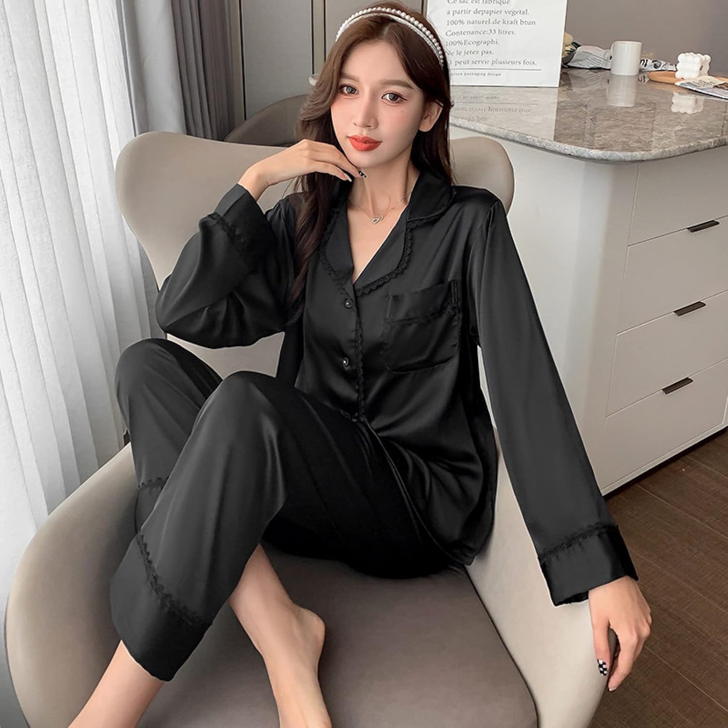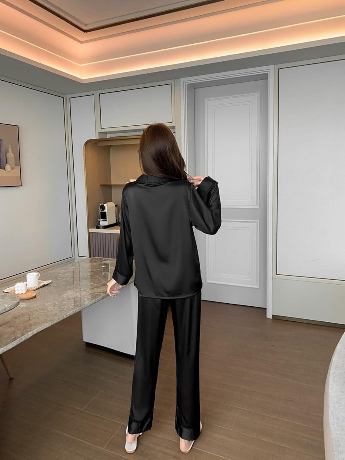 WOMEN PYJAMAS SETS that will make you feel great in a bedroom and also a stylish for lazy Weekends at home. MATERIAL :The silk pyjamas womens made of 100% Polyester. women's PJs provides a smooth and soft feeling to ensure your good sleep.Satin pyjamas with soft lightweight for a comfortable airy feels throughout the night.RelaxedSTYLE :Silky Smoothness; Lightweight; Super Soft; Friendly to the skin; Regular Fit.SEASON : All SeasonLOUNGING around House --- You would feel relaxed and comfortable in these sleepwear sets No matter what you are doing in your house.VACATION Requirement --- Feel Relieved by the clean and silky pajamas loungewear in when you are in a hotelOCCASION: Sleeping/Lounging/girls day/bridal sleepwear/Wedding/Pajama Party/Hotel/Vacation.A PERFECT GIFT: This satin pyjamas for women is a perfect amazing gift choice for women wife girlfriend sister or daughter as a Christmas and new years gift.CARE INSTRUCTION: Machine wash cold with like colors. Do not bleach. Tumble dry low. Do not dry clean."Please contact us promptly if you have any questions about the product, and we will reply to you within 24 hours.