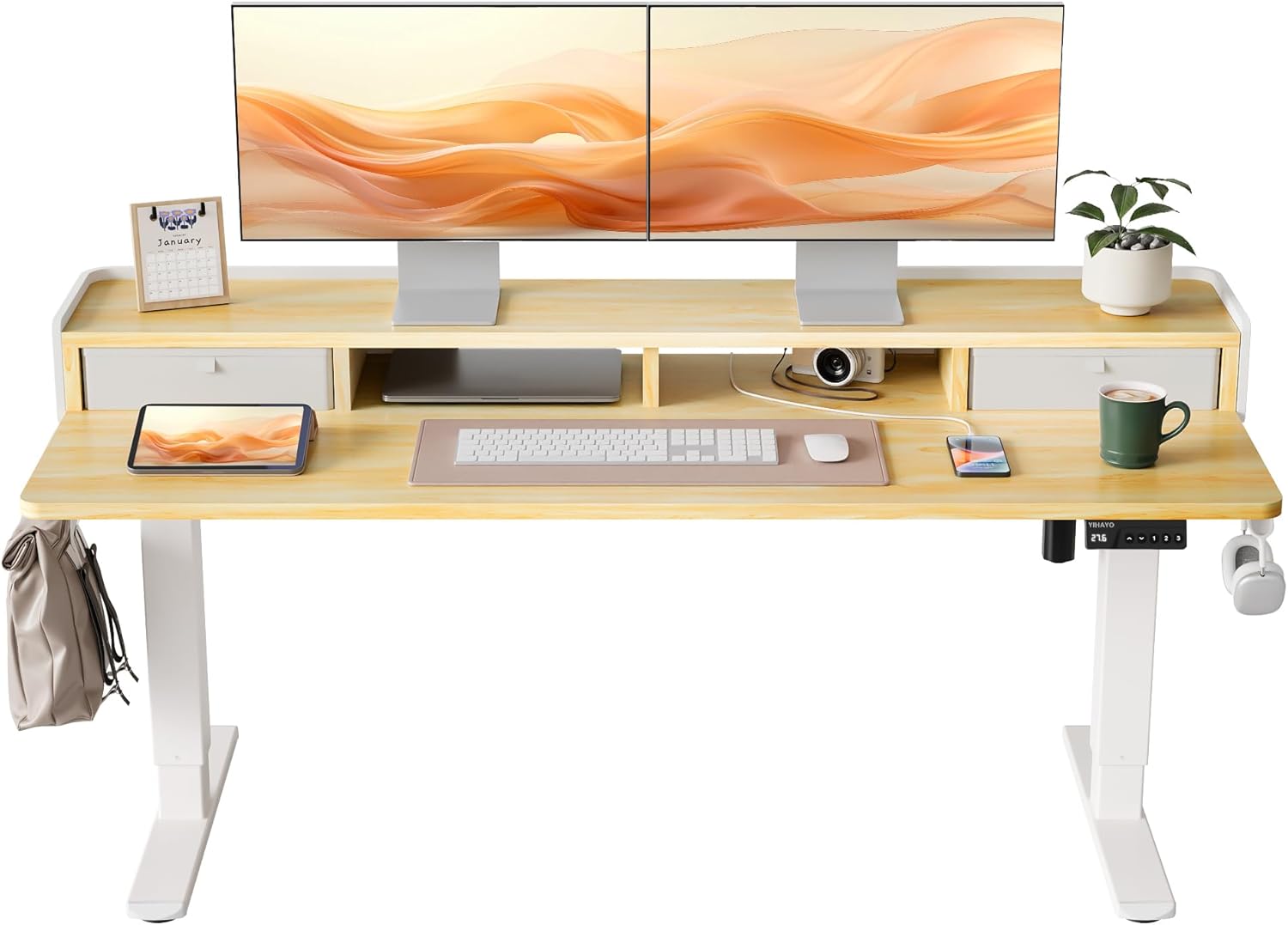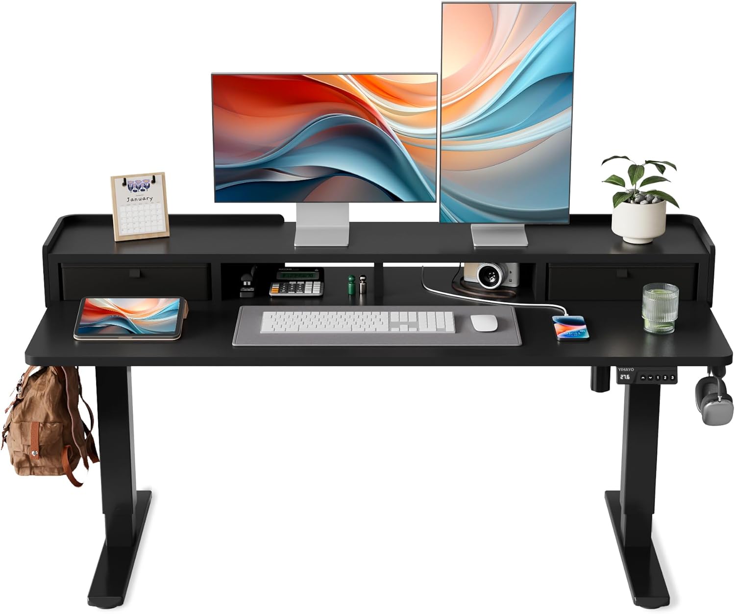 Welcome to the world of next-generation desks! We are proud to present to you this newly designed electric standing desk that will revolutionize your work experience. Built upon outstanding functionality and stability, we've paid attention to detailed design to create your ideal working environment. Whether for an office, home office, or study space, this electric standing desk is poised to offer an exceptional experience. Size and Load Capacity: This electric standing desk boasts generous dimensions, with a length of 48 inches and a width of 24 inches, providing ample space for work equipment and personal items. It offers reliable stability with a load capacity of up to 176 pounds, able to steadily support computer equipment, books, office supplies, and more. Height Range and Materials: To deliver the optimum user experience, this electric standing desk features a broad height range, with flexible adjustment from 18.1 inches to 28.3 inches to accommodate various statures and work demands. Stability is one of the key factors, and this desk features high-quality metal legs for enduring stability, while the desktop is made of solid wood, durable and elegant, adding a touch of nature to the workspace. Features and Additional Functions: This electric standing desk is equipped with an advanced electric lift system that enables you to easily create a comfortable working posture. It comes with a height memory button to save your preferred working heights, allowing one-touch adjustments. The spacious desktop design includes a monitor stand for easy placement of your screens, offering a comfortable viewing experience. Two drawers are also designed into the desktop, providing convenient storage for documents, stationery, and other office essentials. In addition, the electric standing desk comes with cable management ports to neatly organize and conceal wires, keeping the work area tidy. The desk is also fitted with hooks to hang bags, headphones, and other items for easy access. Its anti-collision feature ensures desk safety by rebounding when encountering obstacles, automatically returning to the previous position if resistance is detected. Quiet Operation and Modern Aesthetic: Beyond its powerful features, the operation of this electric standing desk is incredibly quiet. With an ultra-quiet design, noise is kept below 40 decibels. This means the desk won’t make disturbing noises while you work or study, providing a peaceful work environment. If you're in need of a comfortable desk or an ergonomic workstation, this electric standing desk is your best bet. It weaves modern functionality, stability, and design style into your workspace, enhancing productivity and comfort. This exciting electric standing desk will bring new possibilities to your work experience!