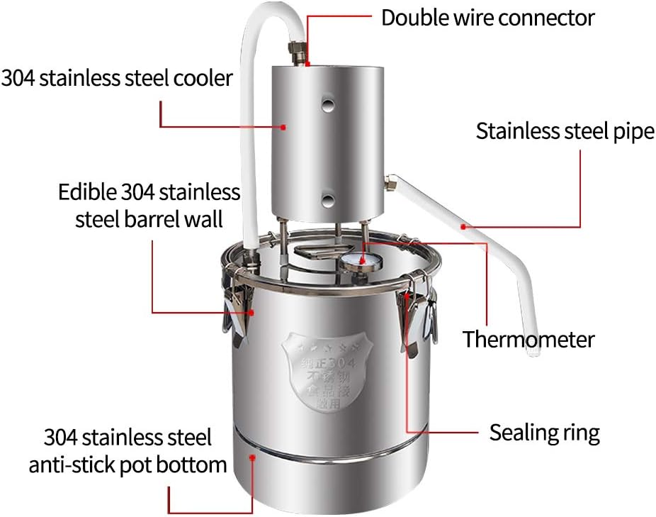 Product details1. Cooler: 304 stainless steel vertical pipe shunt cooler, high production cost, complicated process, one-time stamping and forming. Lifetime free renewal, using triple cooling, lower the wine temperature, mellow taste, and effectively reduce fusel oil.2. Circulating water: the lower interface is the water inlet, and the upper interface is the water outlet, which can ensure the rapid conversion of wine steam into wine to achieve the purpose of rapid wine output3. The main body of the equipment: It is made of food-grade 304 stainless steel, which is durable and can be used for up to 12 years. There are two handles that can bear 300 kg on both sides of the pot, and four quick bayonet bays make the seal more stringent.4. Steaming tray: Set a steaming tray slot at 10 cm inside the barrel, and put it into the steaming tray very tightly. It is very convenient for steaming grain or making solid. It is not suitable for grain to fall into the bottom of the barrel, with good stability and no deformation.5. Thermometer: when the temperature reaches about 85 degrees, turn on the water circulation system, and the wine will start to flow out. The greater the firepower, the faster the wine, the lower the firepower and the slower the wine. Control the firepower to let the wine flow out at a uniform rate.6. One-way exhaust valve: One-way valve is installed during fermentation, and one-half of water is added to it to ensure that during the fermentation process, only the air can be discharged but not the air.