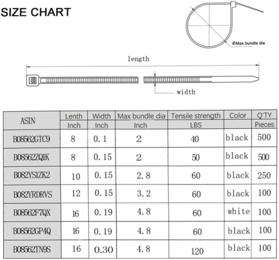 Nylon zip ties Technical Characteristics: Cable tie head use 3 latches for stronger locks Environmentally friendly material, Durable Guarantees Latest PA66 nylon materiallndustrial grade tensile strength Long-term use at temperatures of -30 ° C to 80 ° C. The flammability rating is 94V-2. Anti-UV. Wide Appliciation Surroundings: The cable ties are Applicable for residential daily and industrial manufacturing. Widely used in Personal, Family, Electronics factory, Gift and Toy Factory Building,Garden,Packing,Transpotation,Indoor&Outdoor, Auto Wire processing plant, Fresh Supermarkets, Office and so on. More Details Colour: black Packing: 100 pcs Specification: Length: 12 inch Width: 0.2inch Thickness: 0.05 inch Bundle diameter: 3.2 inch 100% Satisfied Customer Services! and provide 100% guarantee, easily contact customer service team! We ensure that you will get a good cable tie kit with super reasonable price!