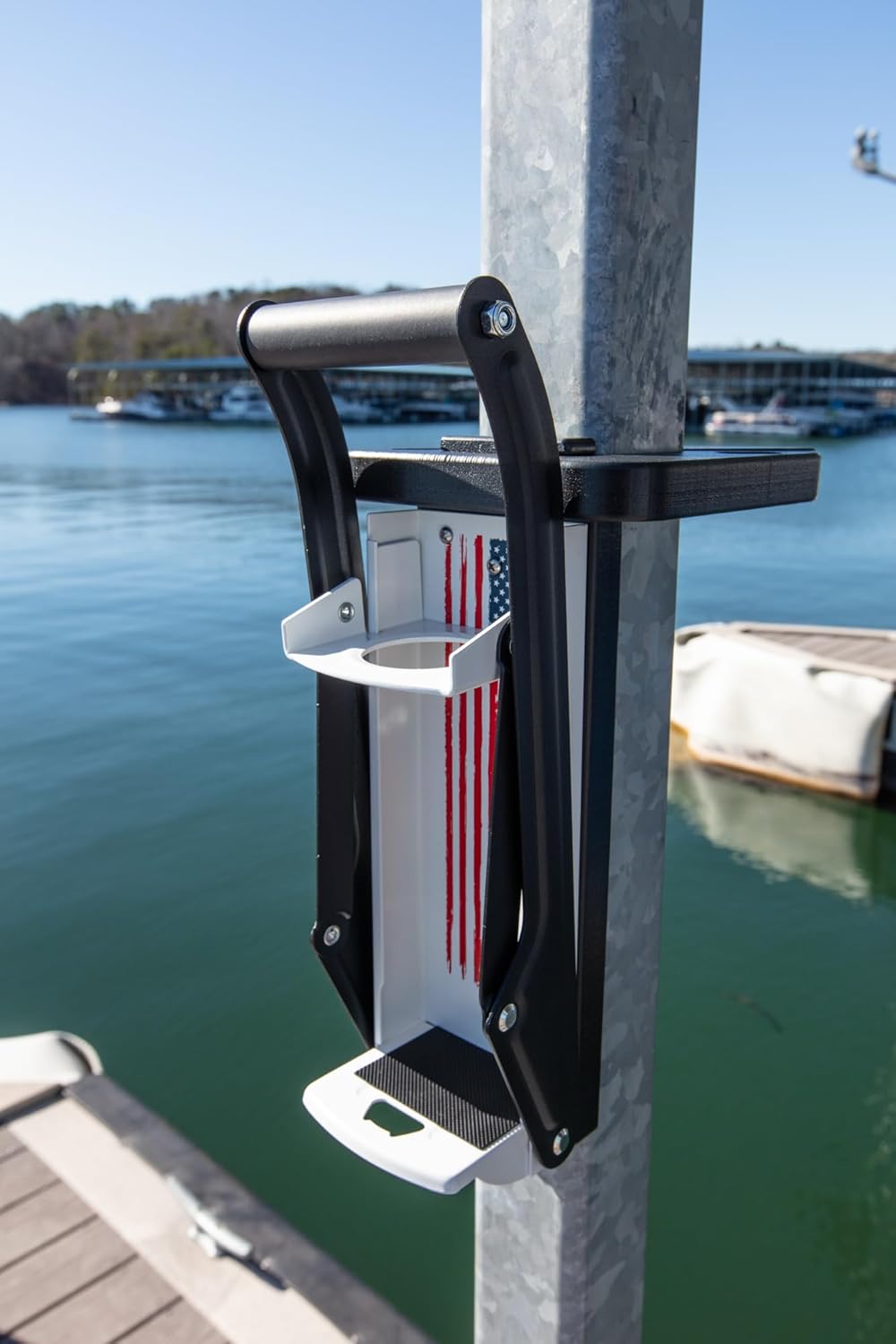 Introducing the DockBloxx Dock-Mounted Can Crusher—the ultimate solution for effortlessly crushing aluminum cans and saving valuable space on your dock! No more clunky trash compactors and bulky bins, just a space-saving solution that fits seamlessly into your waterfront living lifestyle. Our can crusher is designed to mount directly onto your dock (square posts), making it easy to crush and conveniently dispose of aluminum cans. Whether you're enjoying a cold beer, soda, or a refreshing hard seltzer, our dock-mounted can crusher is the perfect accessory for any water-loving individual. Designed with heavy-duty construction, the Dock-Mounted Can Crusher is built to last, making it a great home gadget for those who want to make a positive impact on the environment. Don't let empty soda cans clutter up your dock any longer. From pneumatic to electric can crushers, we've got you covered with a variety of space-saving products. Displays as a metal American flag when not in use. Manage clutter with our top-of-the-line dock-mounted can crusher. You won't be disappointed!
