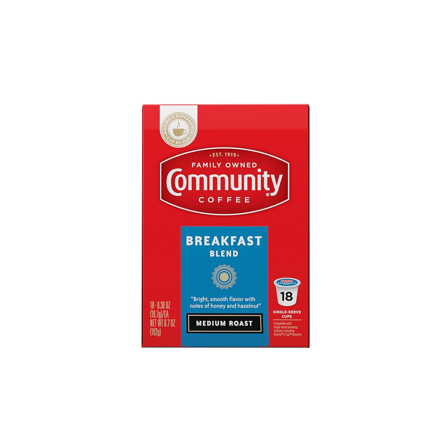 This aromatic, medium roast is sure to awaken your senses and follow with a smooth and bright finish. We purposefully source the beans of our Breakfast Blend to highlight the full-bodied flavors of South and Central America. We then carefully roast them to bring out notes of honey and hazelnut, developing a rich, smooth flavor that will make the first cup of the day your favorite. Made from only 100% select Arabica coffee beans. This product contains a 12 pack of 18 single serve coffee pods (Keurig compatible K-Cups™). Enjoy 216 cups of coffee. About Community Coffee Since Cap blended the first batch of Community® coffee, we’ve seen plenty of change — both inside and outside the company. We’ve evolved to better serve our customers, but we’ve also tried to stay true to our roots and the community that got us started. That’s why for over 100 years we’ve maintained an unwavering dedication to making the best-tasting, highest-quality coffee we possibly can — all while developing better methods of sourcing, superior roasting techniques and innovative ideas to keep our coffee at its peak of flavor and freshness. We simply love making coffee, and we find inspiration in every part of the process, from planting the beans to serving the perfect cup. Above all, we're inspired by the people we work with, the customers we serve and the connections we’ve built together.