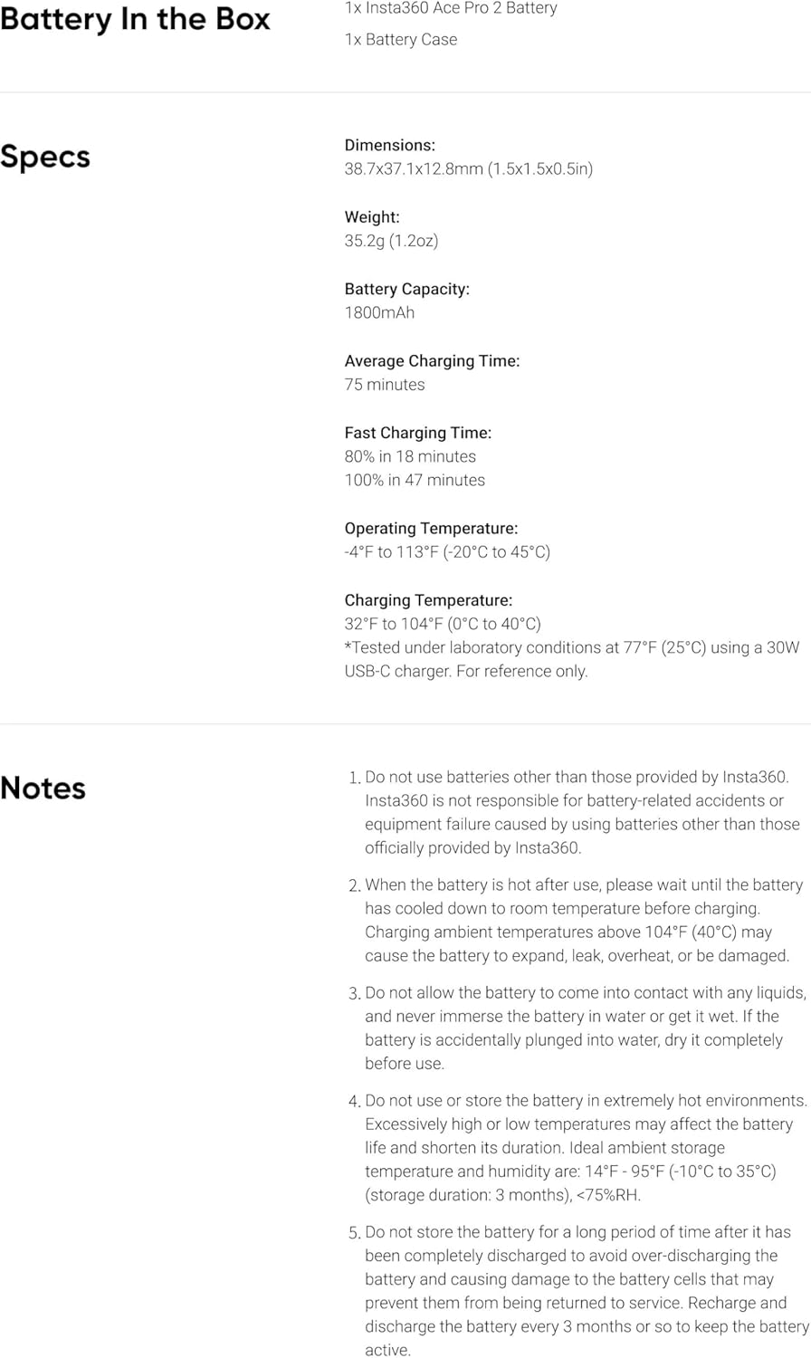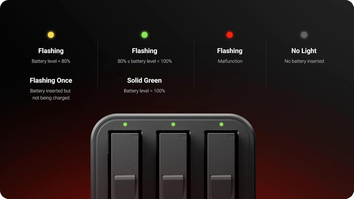 The Insta360 Fast Charge Hub is a triple bay charger designed specifically for Insta360 ACE/ACE PRO Batteries. This charger can charge (1) one, two (2) or three (3) batteries simultaneously (x2 faster charge than charging through the camera). With an integrated smart charging circuit, this charger automatically optimizing the charging sequence when more than one battery is connected. The indicator lights on the Fast Charge Hub will flash red/green once the hub is connected to USB Type-C charging cable and plugged into a compatible wall adapter (USB wall adapter sold separate - 2A rated adapter required).When the battery is inserted into the slot the charger will then analyze the battery and illuminate red during the charging sequence. Once the charge is complete the indicator light will illuminate green. Fast Charge Hub SpecificationInputUSB-C Smart Charging 12V/3A Charging portUSB Type-CWorking Temperature-4F to 104F (-20C to 40 C)Charing Temperature32F to 104FCompatible DevicesCharges up to x3 Insta360 Ace Pro 2/ACE/ACE PRO BatteriesBattery Base SpecificationsRated Voltage: 3.85VMax Charge: 4.4VRated Power: 1800mAh / 5.46Wh