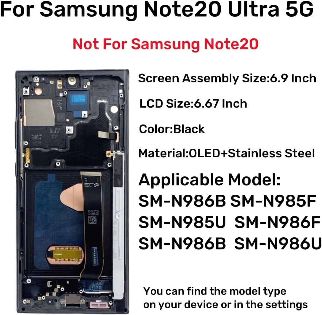 Important 1.This is New OLED Screen replacement for Samsung Galaxy Note 20 Ultra 5G ,not original . 2.This screen only fit for samsung Galsxy Note 20 Ultra 5G US Version. 3.This Note 20 Ultra screen used to replace old brocken screen. 4.This screen frame is pre-assembled,you don’t need to remove the old frame. 5.This item includes a professional full set of repair tools. 6.This item don’t include Instructions. Package Included: OLED screen with frame for Samsung Note 20 Ultra 5G1 Battery adhesive x1 Back cover adhesive x1 SIM eject pin x1 Screwdriver +2.0 x1 Screwdriver +1.6 x1 Screwdriver -2.0 x1 Nylon plastic spudger opening tool pry bar x1 Triangle metal pry pieces openers x1 Suction cup x1 Tweezers x1 Clean Alcohol Wipe x1 Rubber band x6 After-Sales Service We provide 24 hours quick reply,If you are not 100% satisfied with our product ,please fell free to contact us via Amazon and will be our pleasure to serve you.