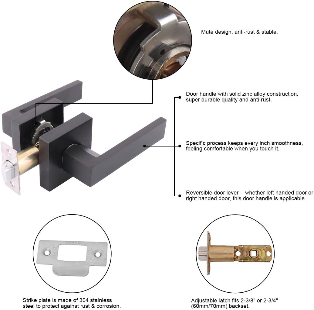 Passage Keyless Door Lever Lock Set Knob Handle (Non-locking), Hallway Doors Closets, Iron Black, Reversible for Right or Left SidePassage Keyless Door Lever Lock Set Knob Handle (Non-locking), Hallway Doors Closets, Iron Black, Reversible for Right or Left SideSpecifications:Lock Core Material: CopperDoor Lever Material: Zinc AlloyStrike Plate Material: 304 Stainless SteelAdjustable Backset Size: 2-3/8-Inches (60mm) or 2-3/4-Inches (70mm)Fit doors between 1-3/8-Inches (35mm) and 2 Inches (50mm)Functionality: Passage (hallway, closets, pantry, laundry door) Passage Door Lever Contents:1 x Door Lever Handle(Reversible)1 x Diagram Template for Installation1 x Latch Mechanism1 x Strike PlateSome Mounting ScrewsAttention:1. Please make sure your door hole and thickness to fit the item size before buying.2. Please allow 2%-3% difference due for different manual measurement.3. Due to the light and screen setting difference, the items color may be slightly different from the pictures.Order Help:Keyed Entrance Door levers are generally used on exterior doors, but sometimes used on interior doors where security is a concern. Keyed entrance levers have a turn button on the inside backplate, similar to a privacy lock. If the knob is locked from the inside a key is required for entrance.Passage or Hall and Closet Door levers are used on doors that do not require a locking mechanism. Halls, closets, pantry and laundry doors will generally use a passage leverset. Passage levers do not have a locking mechanism.