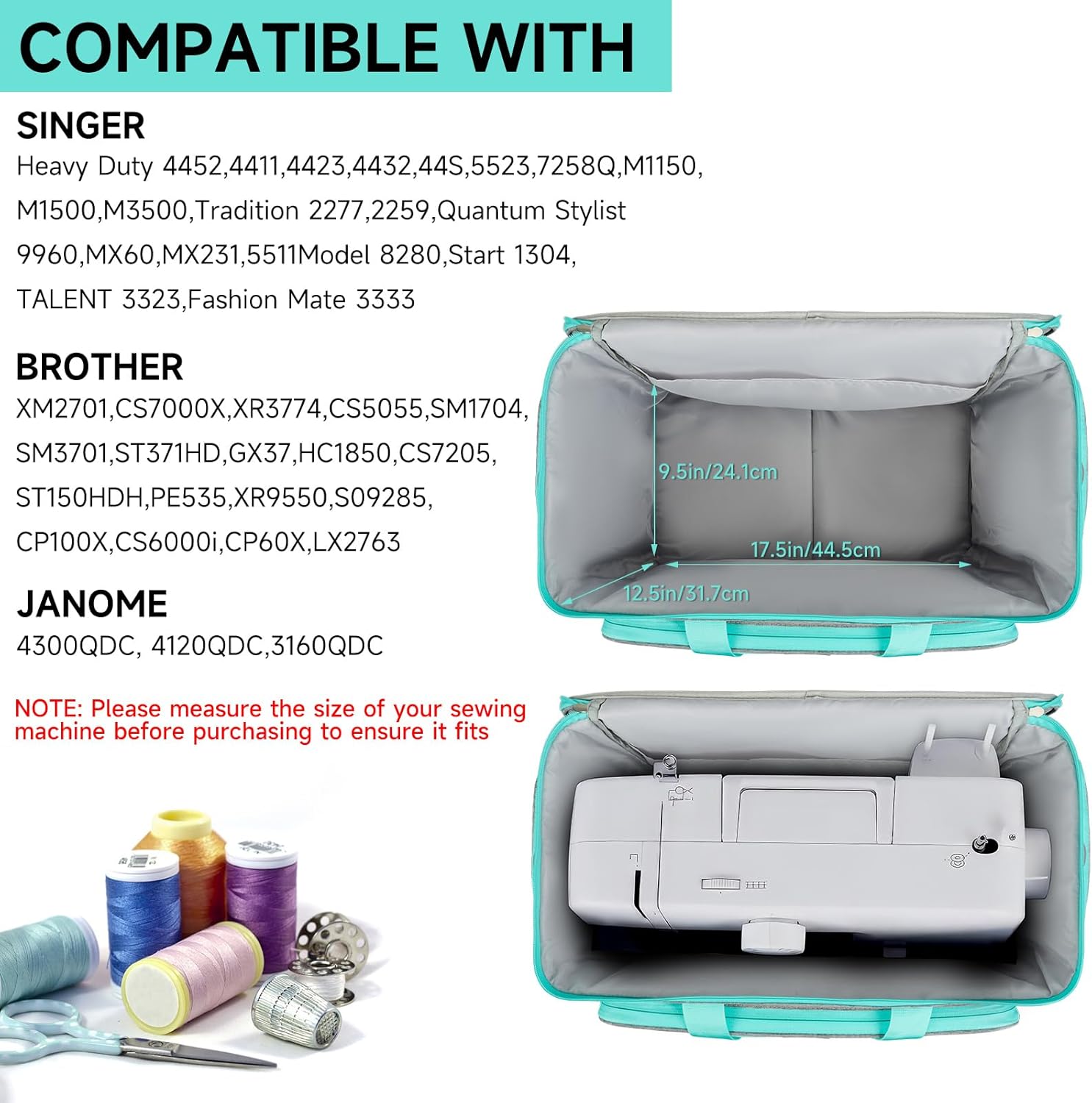 Rolling Sewing Machine Case with Wheels,Sewing Machine Carrying Bag,Trolley Tote Bag Fits for Most Standard Singer,Brother,Janome Sewing Machine and Accessories,Grey/Green