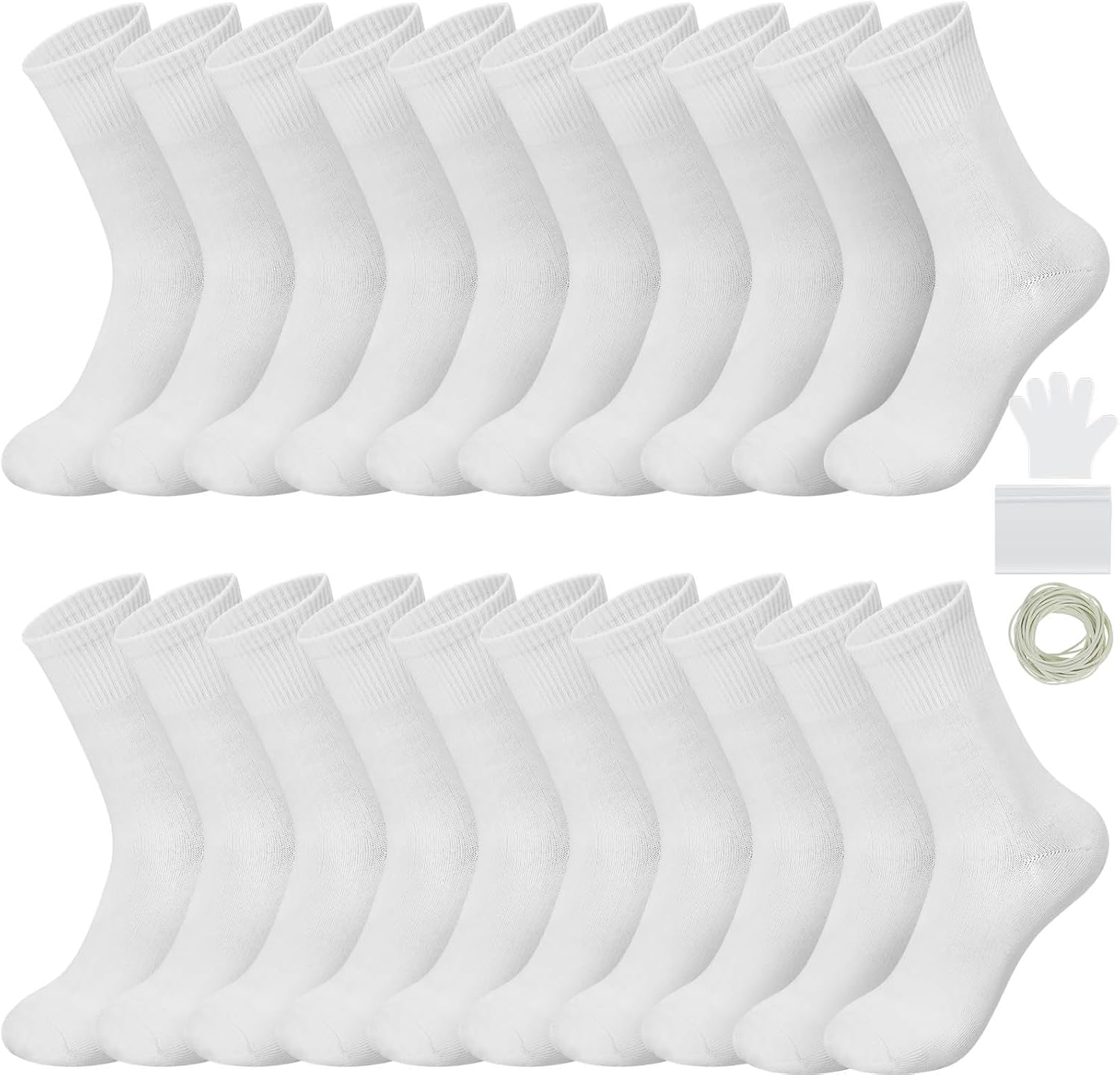 Features: The tie dye kit socks and accessories arrive in counted packs. Rubber bands are bundled, and bags are grouped, simplifying setup and helping manage all parts of your creative project. This comprehensive DIY socks women collection serves as a thoughtful present. It holds essentials for a crafting day, providing a distinctive activity for celebrations or time with family and friends. Specifications: Material: polyamide Color: white Size: M is suitable for women in us sizes 22.5-24.6cm Package includes: 40 x White Cotton Crew Socks 120 x White Rubber Bands 40 x PE Transparent Disposable Gloves 40 x Transparent Resealable Bags Notes: Manual measurement, please allow slight errors on size. The color may exist a slight difference due to different screen displays