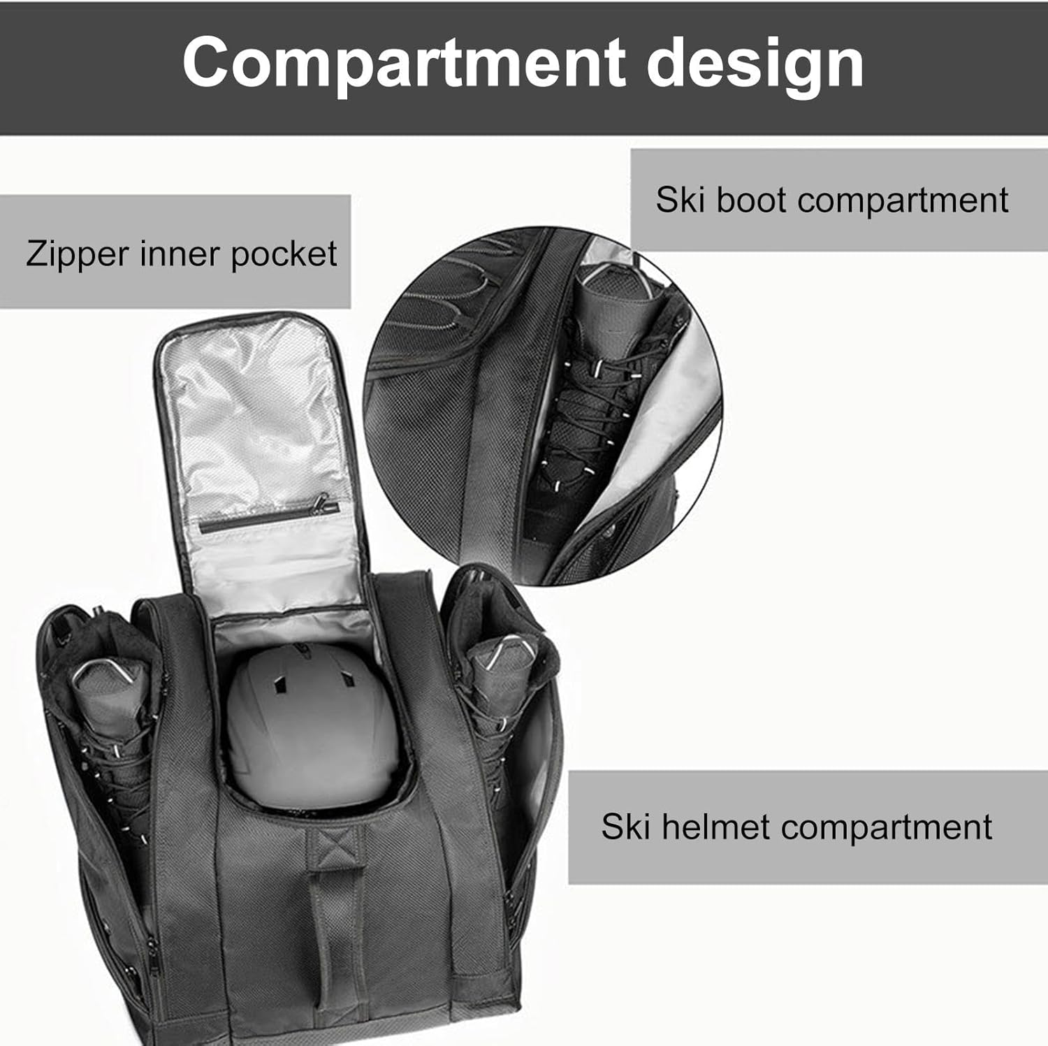 Ski Boot Backpack Waterproof Ski Accessories Bag - 50L Ski Boot Bag Backpack, Nylon Waterproof Ski Bag for Skis Snowboard and AccessoriesKeep your ski boots and gear organized and easily accessible with our high-quality ski boot bag. Made of excellent materials and featuring an ergonomic design, it is versatile and widely used. Multiple small pockets and a reinforced non-slip bottom add convenience and durability.Specification:Product name: Ski Boot BagMaterial: Oxford clothSingle product size: about 43x36x43cm/16.93x14.17x16.93 inchesSingle product packaging size: about 40x30x11cm/15.75x11.81x4.33 inchesWeight: 1.35kgCapacity: 50LProduct List:1* Ski Boot BagNotes: Due to the lighting effects and filming angles, there is a color difference in the product, please understand.Due to manual measurement, there is a tolerance in the product size.The actual product shall prevail, thank you!